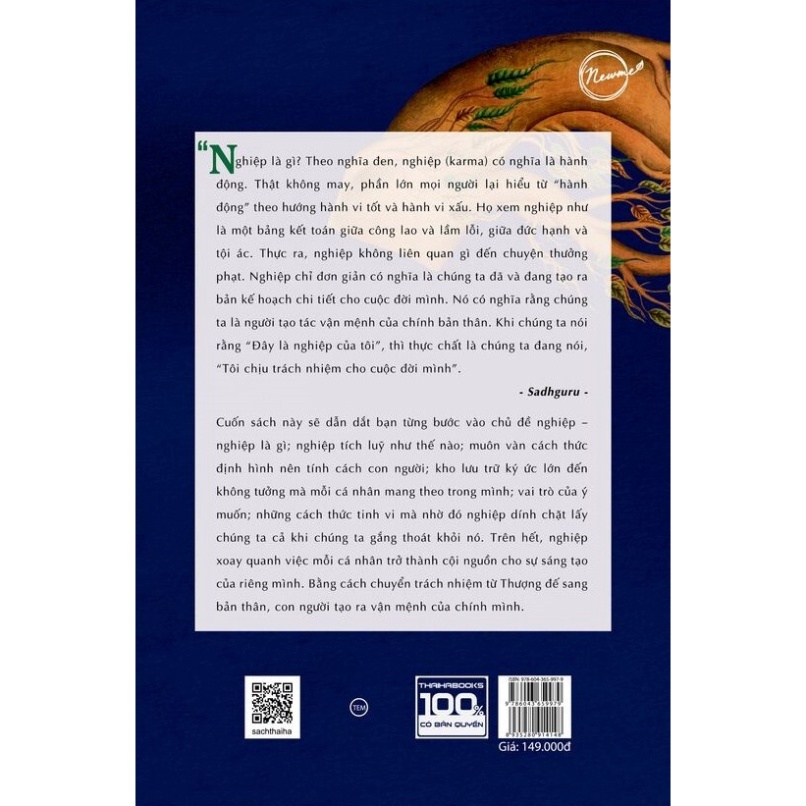 “Những điều bạn thích và không thích chính là nền tảng cho nghiệp quả của bạn”. Nghiệp – một phần tất yếu trong cuộc đời mỗi chúng ta. Cái cơ chế quy định rằng chúng ta không thể nào trốn tránh hệ quả phát sinh từ những hành động của bản thân. Cái chu kỳ dường như bám riết lấy chúng ta bất kể chúng ta có đi đến đâu. Hy vọng cuốn sách này sẽ vừa là một tài liệu tham khảo, vừa là một cẩm nang cung cấp cho độc giả những bí quyết sống một cách sáng suốt và yên vui trong thế giới nhiều thách thức này. Trong quá trình đó, cuốn sách cố gắng khôi phục lại tiềm năng chuyển hóa nguyên bản của từ “nghiệp”. Mong rằng cuốn sách sẽ tháo gỡ những hiểu lầm đang ngày càng lớn dần, đồng thời giúp bạn hiểu rõ toàn bộ sức mạnh ban sơ của nghiệp cũng như tác động cộng hưởng mãnh liệt của nó. Tác giả: Sadhguru là một vị yogi, một nhà huyền linh và một người có tầm nhìn xa. Ông được vinh danh là một trong năm mươi người có ảnh hưởng nhất Ấn Độ. Ông cũng từng được trao ba giải thưởng công dân ở Ấn Độ, trong đó có một giải thưởng vì những hoạt động về môi trường cũng như giải thưởng công dân hằng năm cao quý nhất của đất nước dành cho những đóng góp xuất sắc và đặc biệt của ông. Ngoài ra, ông còn là một diễn giả và là người có sức ảnh hưởng dư luận nổi tiếng thế giới. Ông đã phát biểu tại nhiều diễn đàn khác nhau trên toàn cầu, bao gồm Liên Hợp Quốc, Diễn đàn Kinh tế thế giới, Ngân hàng Thế giới, Thượng viện Vương quốc Anh, TED và các trụ sở của Microsoft và Google. Ông cũng đã được mời đến diễn thuyết tại các tổ chức giáo dục hàng đầu – trong đó có thể kể đến Oxford, Stanford, Harvard, Yale, Wharton và MIT. Mục lục: Làm sáng tỏ về nghiệp: Dẫn nhập Phần 1: Nghiệp: Điều bí ẩn muốn đời Ý muốn: Nền tảng của nghiệp Nghiệp là ký ức Kho nghiệp khổng lồ Mọi sự bắt đầu như thế nào? Phần 2: Karma Yoga Karma Yoga và Cơ thể vật lý Karma Yoga và Cơ thể tâm trí Karma Yoga và Cơ thể năng lượng Phần 3: Lưu ý đối với độc giả Những luận bàn về nghiệp Lời kết: Nghiệp và bộ trang sức của cô gái làng chơi hạng sang