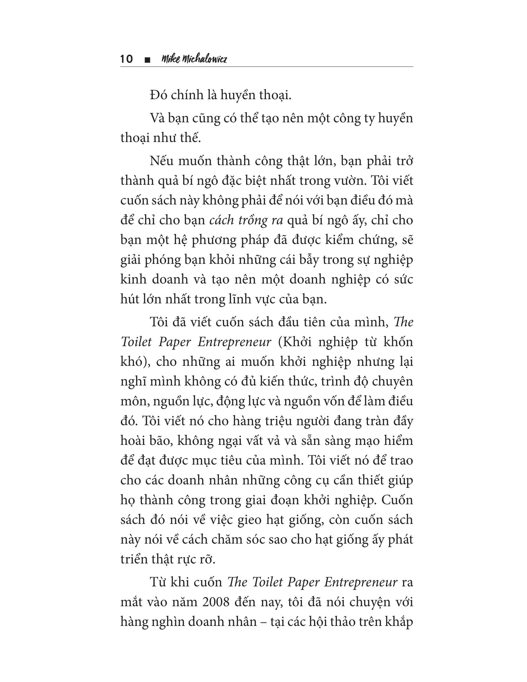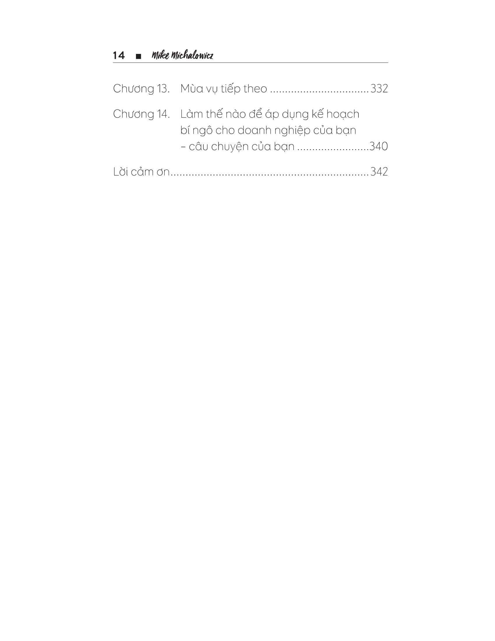 • Các sinh viên chuẩn bị bước vào thị trường lao động, những nhân viên, bất cứ ai mong muốn đóng góp điều gì đó có ý nghĩa cho thế giới này. THÔNG TIN TÁC GIẢ Mike Michalowicz Trước tuổi 35, ông đã thành lập và bán thành công hai công ty trị giá hàng triệu đô-la. Ông sáng lập Profit First, một công cụ được hàng trăm nghìn công ty trên toàn cầu sử dụng để thúc đẩy lợi nhuận. Ông là tác giả của nhiều đầu sách như: Fix This Next, Surge, The Pumpkin Plan, Profit First và The Toilet Paper Entrepreneur. Ông từng là chuyên gia bình luận về doanh nghiệp nhỏ cho tờ The Wall Street Journal và dẫn chương trình giải cứu doanh nghiệp trên MSNBC. Mike là diễn giả chính nổi tiếng trên các diễn đàn về chủ đề khởi nghiệp sáng tạo, đồng thời còn là diễn giả khách mời cho các chương trình khởi nghiệp tại các trường đại học như Columbia, Copenhagen Business School, Emerson, Harvard, Penn State, Pepperdine và Princeton. ĐÁNH GIÁ/ NHẬN XÉT CỦA BÁO CHÍ/CHUYÊN GIA “Mỗi trang, mỗi chương, khi đọc cuốn sách này, tôi đều tự hỏi, sao m.ình lại không nghĩ ra nhỉ? Thật đáng kinh ngạc! Quả là một cuốn sách tuyệt vời. Một quả bí ngô! Ai mà ngờ được chứ? Tất cả các doanh nhân, chủ doanh nghiệp, hãy đọc nó đi! Hãy làm ngay đi!” —Michael Gerber, tác giả của The E-Myth và là người sáng tạo ra The E-Myth Evolution “Một cuốn sách tuyệt vời khác của Mike Michalowicz! Sự hài hước ngẫu hứng và hiểu biết sâu sắc về kinh doanh của Mike đảm bảo rằng Kế hoạch bí ngô là một cuốn sách mà các doanh nhân nên đọc trong nhiều năm tới.”—Guy Kawasaki, tác giả của Enchantment và The Art of the Start “Những lời khuyên sâu sắc, thẳng thắn hướng đến những doanh nhân đang mắc kẹt giữa sự chung chung thay vì cụ thể, có ý nghĩa. Rất nhiều hạt giống đáng để gieo trồng.”—Seth Godin, tác giả của Con bò tía “Michalowicz lại một lần nữa thành công rực rỡ. Kế hoạch bí ngô tràn ngập sự hài hước tuyệt vời của Mike và là một hướng dẫn từng bước phi thường dành cho những doanh nhân đang gặp khó khăn trong việc phát triển kinh doanh.”—J. J. Ramberg, người dẫn chương trình Your Business của MSNBC “Với phong cách ‘điên rồ như cáo’, Mike Michalowicz tiết lộ lý do tại sao việc bắt chước một người nông dân trồng bí ngô lại mang đến cho bạn thành công vượt trội. Michalowicz đang nhanh chóng trở thành một trong những tác giả kinh doanh sáng tạo nhất thời đại.”—Rieva Lesonsky, Giám đốc điều hành của GrowBiz Media, cựu biên tập viên tạp chí Entrepreneur “Mike giúp việc biến doanh nghiệp của bạn từ bình thường thành phi thường trở nên dễ dàng như làm theo một công thức đơn giản từng bước. Cuốn sách này hé lộ những kiến thức và sự thông thái mà tôi hiếm khi thấy trong các tác phẩm trước đây. Nếu bạn chỉ đọc một cuốn sách trong năm nay, hãy chọn Kế hoạch bí ngô.”—Bob Burg, đồng tác giả của The Go-Giver và Endless Referrals TRÍCH ĐOẠN “Kinh doanh không phải là một cuộc ganh đua về danh tiếng. Đừng bận tâm về việc phải có được nhiều khách hàng nhất. Hãy gây dựng một doanh nghiệp có thể đáp ứng nhu cầu của những khách hàng tốt nhất... phù hợp với bạn nhất. Bạn không cần phải được bầu chọn làm nữ hoàng của buổi dạ tiệc, mà chỉ cần một nhóm bạn thân thiết với tính cách tuyệt vời và tấm lòng kiên định, những người sẵn sàng làm mọi thứ vì bạn, cũng như bạn luôn sẵn sàng vì họ. Hãy luôn là chính m.ình và đừng bao giờ thỏa hiệp.” “Bạn cần nhớ một điều rằng, cũng như trong một vườn bí ngô, việc diệt trừ cỏ dại là một quá trình không ngừng nghỉ. Các công ty đều sẽ thay đổi và khách hàng cũng có kẻ đi người đến. Khi đã nắm được cách thực hiện, cứ mỗi quý, bạn hãy lập một Bảng đánh giá mới. Hãy dành riêng một hoặc hai ngày để đánh giá khách hàng và đưa ra những quyết định khó khăn mà giờ đây đã trở nên quen thuộc. Bạn sẽ chẳng bao giờ biết khi nào thì một cọng cỏ dại đáng ghét hay một quả bí ngô nhiễm bệnh sẽ lẻn vào thôn tính toàn bộ khu vườn của bạn đâu.” “Trong nhiều năm qua, tôi đã phát triển được Bộ ba câu hỏi, tuy đơn giản nhưng lại vô cùng hiệu quả. Nếu được hỏi theo đúng thứ tự, ba câu hỏi này sẽ giúp nhân viên suy nghĩ và đưa ra những quyết định luôn có lợi nhất cho công ty của bạn. Vì chúng rất hiệu quả, nên có lẽ bạn sẽ muốn in một bản các câu hỏi này ra và dán chúng lên bàn làm việc của từng nhân viên... Đây là Bộ ba câu hỏi, sắp xếp đúng thứ tự: