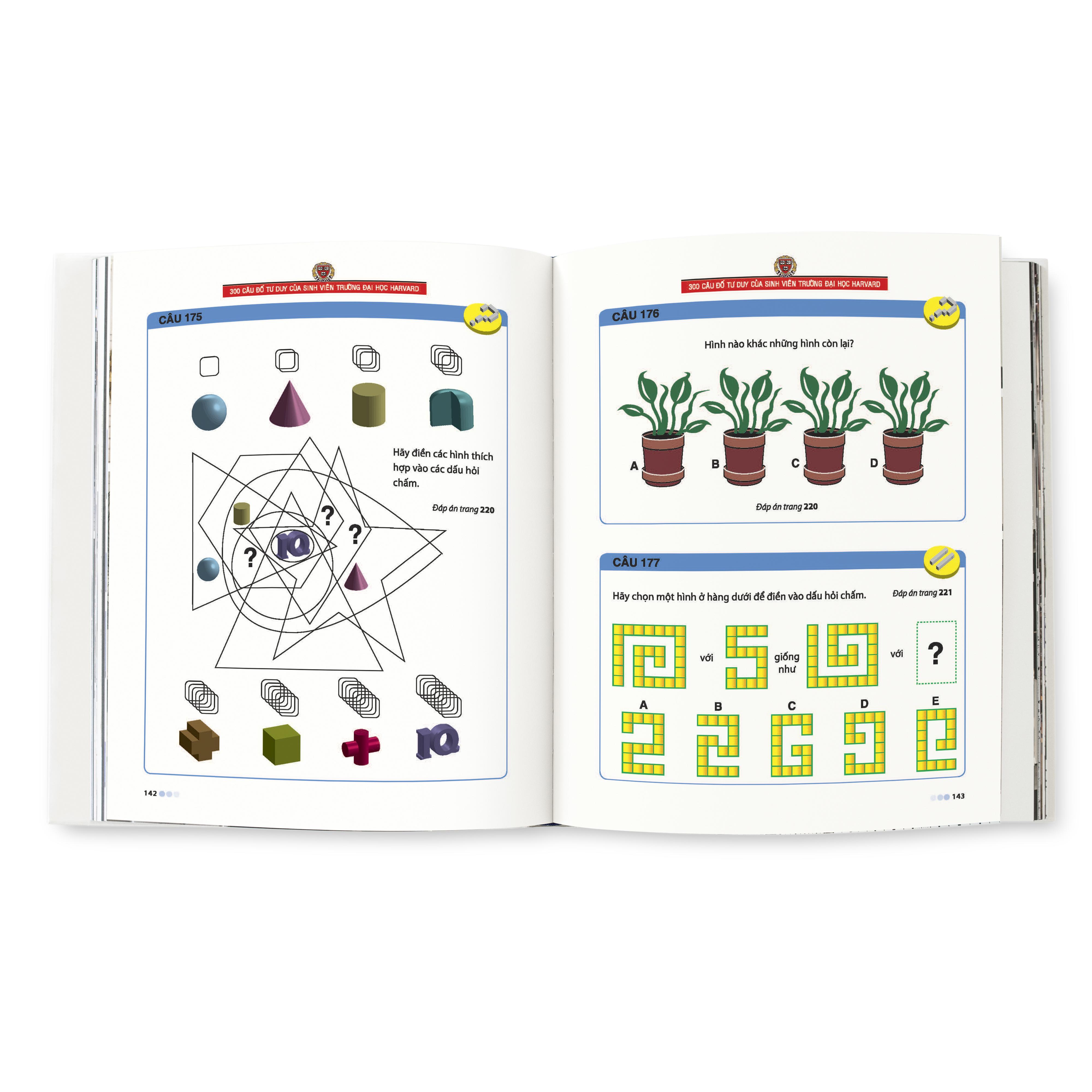 Keep Your Brain Fit - 300 Câu Đố Tư Duy Của Sinh Viên Trường Đại Học Harvard 300 câu đố tư duy của sinh viên trường đại học Harvard là cuốn sách trò chơi bán chạy với số lượng 10 triệu bản trên thế giới, gồm 300 trò chơi tư duy kinh điển, khơi dậy và phát triển toàn diện tiềm năng trí tuệ. Charles Eliot - Hiệu trưởng thứ 21 của trường Đại học Harvard có câu nói rằng: "Niềm hy vọng của loài người được quyết định bởi tư duy của những trí thức tiên phong. Tư duy của họ có thể hơn người thường đến vài năm, vài đời, thậm chí là vài thế kỉ." Đối với trường Đại học nổi tiếng, có lịch sử lâu đời như Harvard, việc bồi dưỡng những nhân tài tư duy nổi trội còn quan trọng hơn nhiều so với việc giảng dạy kiến thức. 300 trò chơi tư duy trong cuốn sách này được trường Harvard chọn lọc để rèn luyện tư duy cho sinh viên của m.ình, mỗi trò chơi đều mang tính đặc trưng, độc đáo, nội dung phong phú, hình thức linh hoạt, với nhiều mức độ khó dễ khác nhau. Những trò chơi này đúc kết những tinh hoa trong việc rèn luyện tư duy của trường Đại học Harvard, giúp khơi dậy và phát triển tiềm năng trí tuệ, nâng cao khả năng quan sát, phân tích, suy luận, phán đoán, tưởng tượng và sáng tạo. Cuốn sách sẽ giúp bạn: