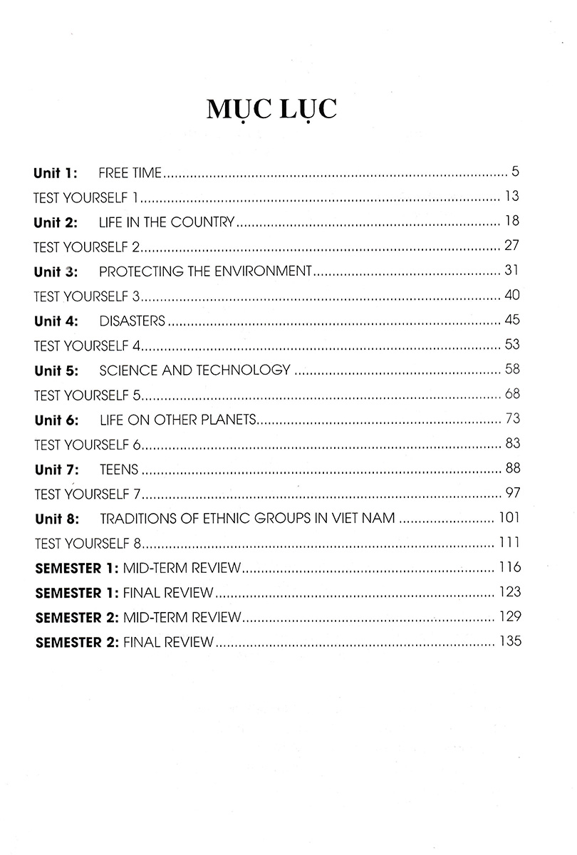 Ngoài ra, còn có phần Tự kiểm tra (Test yourself) ở cuối mỗi đơn vị bải học và các phần ôn tập giữa kì và cuối kì. Các phần này sẽ giúp các em học sinh tự kiểm tra lại những nội dung kiến thức mà mình đã học để kịp thời củng có những kiến thức còn chưa nắm vững.