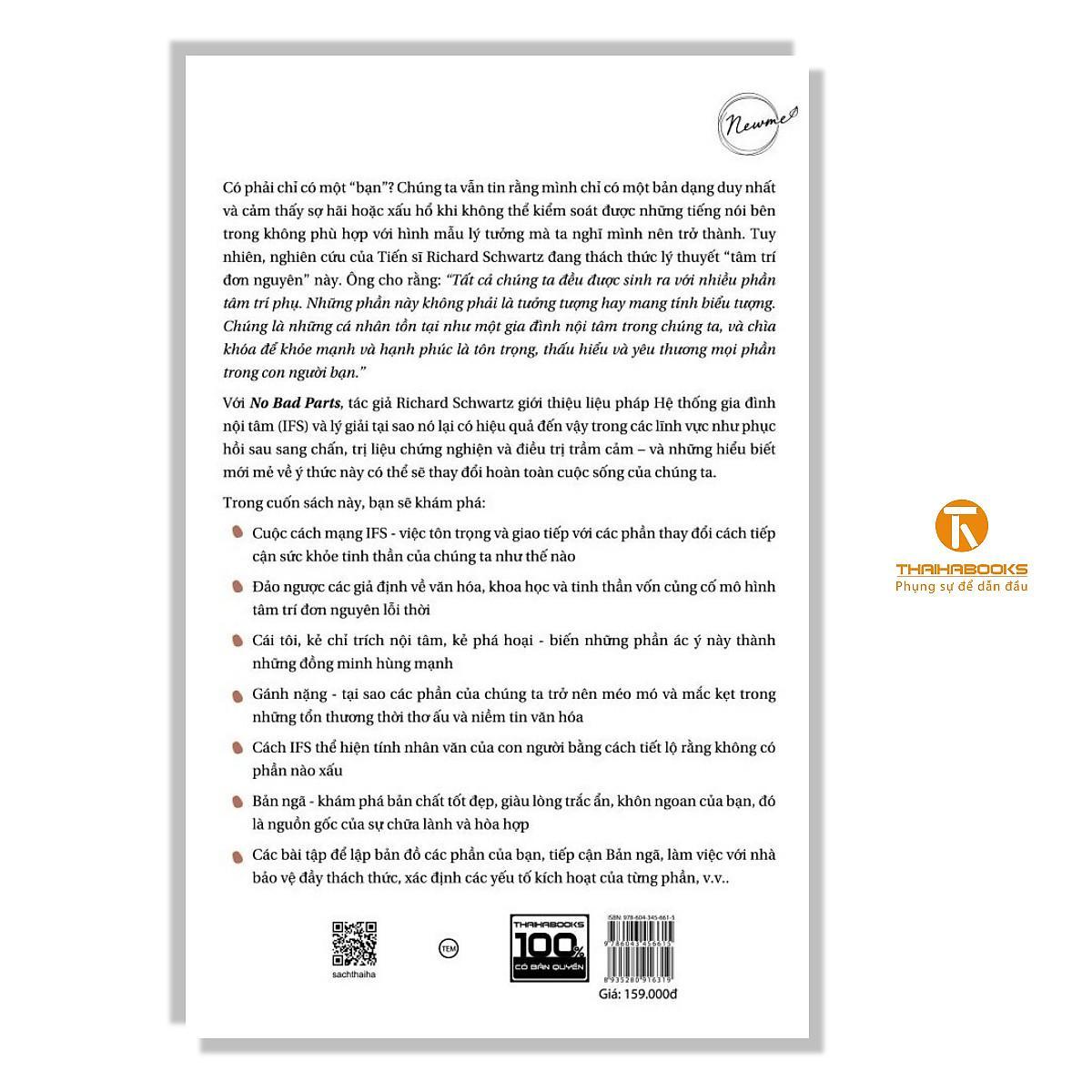 Với No Bad Parts, tác giả Richard Schwartz giới thiệu liệu pháp Hệ thống gia đình nội tâm (IFS) và lý giải tại sao nó lại có hiệu quả đến vậy trong các lĩnh vực như phục hồi sau sang chấn, trị liệu chứng nghiện và dieu tri trầm cảm – và những hiểu biết mới mẻ về ý thức này có thể sẽ thay đổi hoàn toàn cuộc sống của chúng ta.