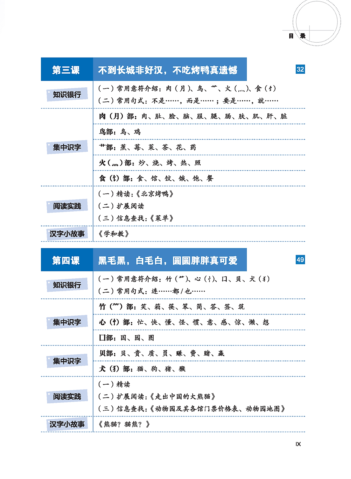 - Ngân hàng tri thức Mảng này giảng giải những tri thức cơ sở về chữ Hán, đồng thời thiết kế phần “Luyện tập” để kiểm tra tình hình lý giải và nắm bắt của học sinh. Phần giảng giải đơn giản, rõ ràng, dễ hiểu, có kèm theo phần dịch tiếng Việt, điều này giúp người học giảm bớt tâm trạng ngại khó khi học chữ Hán, nắm được phương pháp học tập chính xác, nâng cao hứng thú và hiệu suất học tập. Bài 1 và bài 2 chủ yếu giới thiệu về các nét chữ và quy tắc bút thuận của chữ Hán. Bài 3 đến bài 7 giới thiệu về cấu tạo cơ bản của chữ Hán, giảng giải một cách hệ thống về chữ tượng hình, chữ chỉ sự, chữ hội ý và chữ hình thanh; phần chữ hình thanh được chia thành hai bài, một bài chủ yếu giảng giải về ý phù (hình bàng), một bài chủ yếu giảng giải về thanh phù (thanh bàng). Bài 8 giảng giải về ba hiện tượng chữ cận hình, chữ đồng âm và chữ đa âm tồn tại trong tiếng Hán. Bài 9 giới thiệu về mối quan hệ giữa chữ Hán và từ.