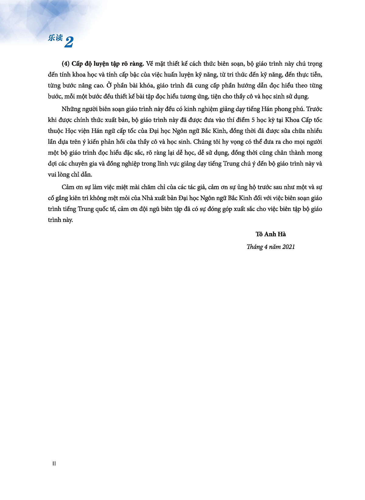 LeDu - Giáo Trình Môn Đọc Hiểu Tiếng Trung - Tập 2 “Le Du - Giáo trình môn Đọc hiểu tiếng Trung, quyển 2” là giáo trình đọc hiểu cấp nhập môn. Mục tiêu giảng dạy của quyển này là bắt đầu từ các nét chữ Hán, thông qua sự dẫn dắt, liên hệ của các ý phù (hình bàng) giúp học sinh tập trung học chữ, mở rộng vốn từ, sau đó thông qua đọc câu và đoạn văn ngắn để củng cố lại từ mới, bồi dưỡng hứng thú đọc cho học sinh, huấn luyện khả năng đọc hiểu của học sinh. Quyển giáo trình này thích hợp sử dụng cho người học tiếng Trung sơ cấp từ chưa biết gì (khởi điểm bằng 0) hoặc đã nắm được khoảng 50 từ ngữ HSK cấp 1. Việc chọn chữ, chọn từ của quyển giáo trình này đều tham khảo từ “Bảng chữ Hán thông dụng” và “Bảng từ ngữ tiếng Hán thông dụng” trong “Đại cương chương trình giảng dạy Hán ngữ quốc tế thông dụng”. Toàn bộ từ mới được chia thành hai phần gồm “Học để nhớ” và “Học để đọc” (sau những từ “học để đọc” có thêm dấu * để phân biệt). Từ vựng ở phần “Học để nhớ” đa số được lấy từ bảng từ cấp 1, bảng từ cấp 2 trong “Đại cương chương trình giảng dạy Hán ngữ quốc tế thông dụng”. Từ mới của phần “Học để nhớ” sẽ xuất hiện trong bảng từ mới ở cuối sách. Từ mới của phần “Học để đọc” chỉ được thiết lập nhằm mở rộng vốn từ cho học sinh và quét sạch chướng ngại khi đọc, nên không cần học sinh ghi nhớ. Từ mới của phần “Học để đọc” không xuất hiện trong bảng từ mới ở cuối sách. Quyển sách này xem trọng việc xuất hiện lặp lại của từ mới, đa số từ mới sẽ xuất hiện lặp đi lặp lại trong cả quyển sách, học sinh xem nhiều tự nhiên sẽ ghi nhớ. Thể lệ của giáo trình Nội dung quyển giáo trình này về cơ bản được sắp xếp theo thứ tự “nét chữ → ý phù (hình bàng) → chữ → từ → câu → đoạn”, cả quyển sách tổng cộng 10 bài, bài cuối cùng là phần kiểm tra tổng kết đối với nội dung của 9 bài trước đó, chủ yếu kiểm tra mức độ nắm vững của học sinh đối với kiến thức cơ bản về chữ Hán và từ mới của phần “Học để nhớ”, dạng đề tham khảo đề thi thật HSK cấp 1, cấp 2. Mỗi bài được chia thành 3 mảng lớn: Ngân hàng tri thức, Tập trung học chữ, Thử thách bản thân.