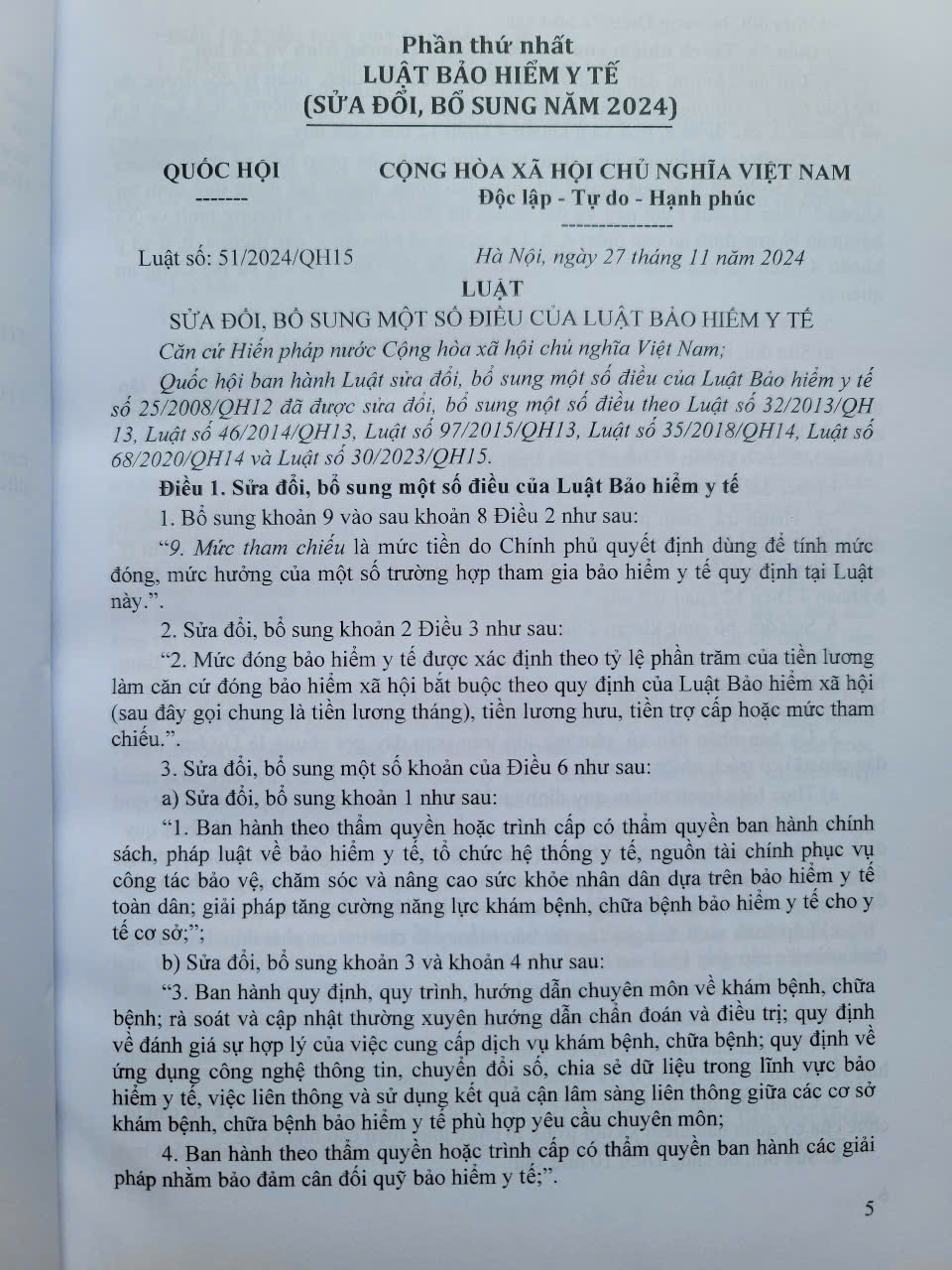 Ngày 27 tháng 11 năm 2024 Quốc hội đã biểu quyết thông qua Luật số 51/2024/QH15 sửa đổi, bổ sung một số điều của Luật Bảo hiểm y tế (gọi tắt là Luật Bảo hiểm y tế sửa đổi, bổ sung 2024), nhằm tiếp tục thể chế hóa quan điểm, chủ trương của Đảng và tăng cường sự lãnh đạo, quản lý của Nhà nước về công tác bảo hiểm y tế. Đồng thời, khắc phục hạn chế, vướng mắc, bất cập của Luật Bảo hiểm y tế hiện hành và đáp ứng yêu cầu thực tiễn khách quan trong tình hình mới. Bảo đảm an sinh xã hội, quyền, lợi ích của người tham gia bảo hiểm y tế, cơ sở khám bệnh, chữa bệnh, từng bước giảm tỷ lệ chi trực tiếp từ tiền túi của người tham gia bảo hiểm y tế; quản lý, sử dụng hiệu quả quỹ bảo hiểm y tế.