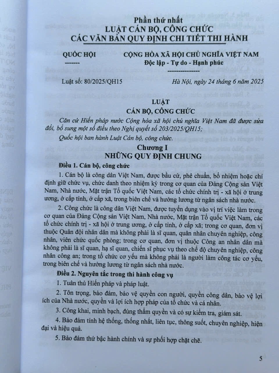 Ngày 24 tháng 6 năm 2025 tại kỳ họp thứ 9 Quốc hội khóa XV, Quốc hội nước Cộng hòa xã hội chủ nghĩa Việt Nam đã thông qua Luật số 80/2025/QH15 Luật Cán bộ, công chức (sau đây gọi tắt là Luật Cán bộ, công chức 2025).