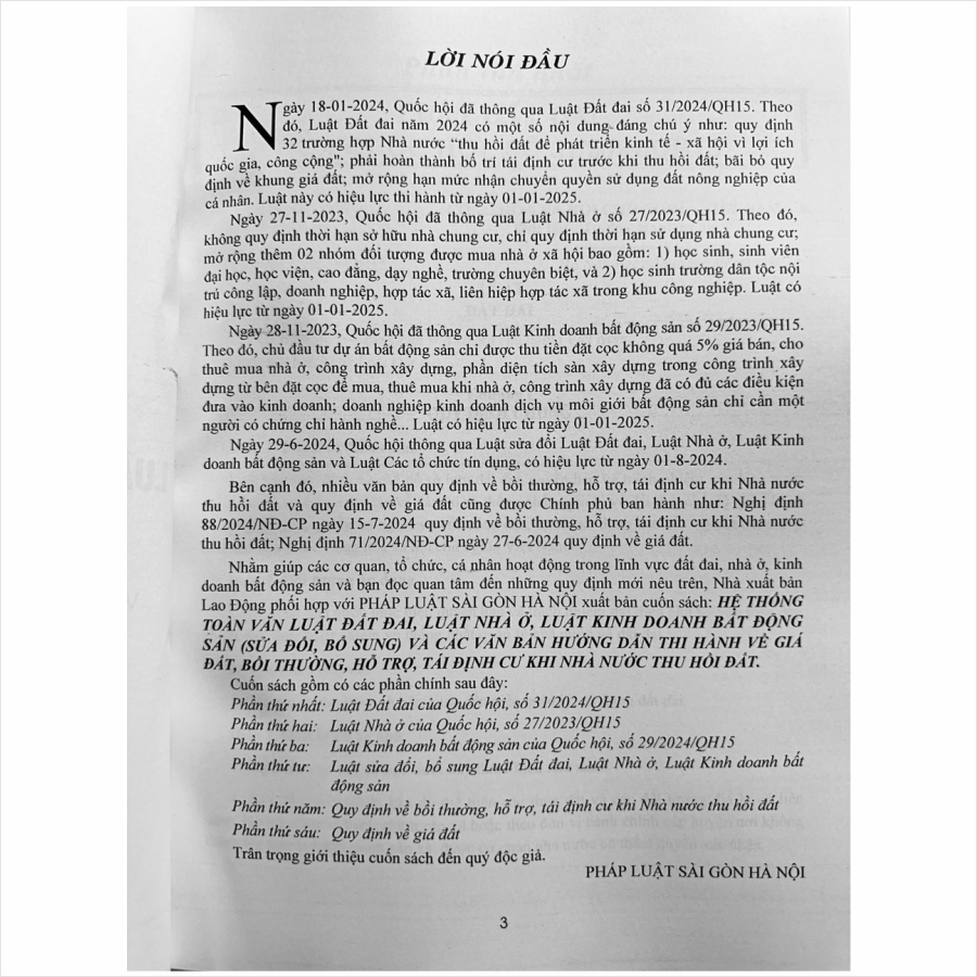 - Toàn bộ sách bìa mềm khổ lớn 20 x 28 cm phân phối bởi Nhà sách Nam Việt đều được bọc sách Plastic MIỄN PHÍ và xuất hóa đơn điện tử đầy đủ, nhanh chóng. …/… Lời giới thiệu: Ngày 18-01-2024, Quốc hội đã thông qua Luật Đất đai số 31/2024/QH15. Theo đó, Luật Đất đai năm 2024 có một số nội dung đáng chú ý như: quy định 32 trường hợp Nhà nước “thu hồi đất để phát triển kinh tế – xã hội vì lợi ích quốc gia, công cộng”; phải hoàn thành bố trí tái định cư trước khi thu hồi đất; bãi bỏ quy định về khung giá đất; mở rộng hạn mức nhận chuyển quyền sử dụng đất nông nghiệp của cá nhân. Luật này có hiệu lực thi hành từ ngày 01-01-2025. Ngày 27-11-2023, Quốc hội đã thông qua Luật Nhà ở số 27/2023/QH15. Theo đó, không quy định thời hạn sở hữu nhà chung cư, chỉ quy định thời hạn sử dụng nhà chung cư; mở rộng thêm 02 nhóm đối tượng được mua nhà ở xã hội bao gồm: 1) học sinh, sinh viên đại học, học viện, cao đẳng, dạy nghề, trường chuyên biệt, và 2) học sinh trường dân tộc nội trú công lập, doanh nghiệp, hợp tác xã, liên hiệp hợp tác xã trong khu công nghiệp. Luật có hiệu lực từ ngày 01-01-2025. Ngày 28-11-2023, Quốc hội đã thông qua Luật Kinh doanh bất động sản số 29/2023/QH15. Theo đó, chủ đầu tư dự án bất động sản chỉ được thu tiền đặt cọc không quá 5% giá bán, cho thuê mua nhà ở, công trình xây dựng, phần diện tích sàn xây dựng trong công trình xây dựng từ bên đặt cọc để mua, thuê mua khi nhà ở, công trình xây dựng đã có đủ các điều kiện đưa vào kinh doanh; doanh nghiệp kinh doanh dịch vụ môi giới bất động sản chỉ cần một người có chứng chỉ hành nghề… Luật có hiệu lực từ ngày 01-01-2025. Ngày 29-6-2024, Quốc hội thông qua Luật sửa đổi Luật Đất đai, Luật Nhà ở, Luật Kinh doanh bất động sản và Luật Các tổ chức tín dụng, có hiệu lực từ ngày 01-8-2024. Bên cạnh đó, nhiều văn bản quy định về bồi thường, hỗ trợ, tái định cư khi Nhà nước thu hồi đất và quy định về giá đất cũng được Chính phủ ban hành như: Nghị định 88/2024/NĐ-CP ngày 15-7-2024 quy định về bồi thường, hỗ trợ, tái định cư khi Nhà nước thu hồi đất; Nghị định 71/2024/NĐ-CP ngày 27-6-2024 quy định về giá đất. Nhằm phổ biến đến Quý Cơ quan, Đơn vị và Quý khách hàng thân thiết nắm bắt kịp thời những quy định mới nêu trên. Nhà sách Nam Việt xin trân trọng giới thiệu cuốn sách: Hệ Thống Toàn Văn Luật Đất Đai, Luật Nhà Ở, Luật Kinh Doanh Bất Động Sản (Sửa Đổi, Bổ Sung) Và Các Văn Bản Hướng Dẫn Thi Hành Về Giá Đất, Bồi Thường, Hỗ Trợ, Tái Định Cư Khi Nhà Nước Thu Hồi Đất …//… Nội dung sách gồm các phần sau: Phần thứ nhất: Luật Đất đai 2024 Phần thứ hai: Luật Nhà ở 2023 Phần thứ ba: Luật Kinh doanh bất động sản 2023 Phần thứ tư: Luật sửa đổi, bổ sung Luật Đất đai, Luật Nhà ở, Luật Kinh doanh bất động sản Phần thứ năm: Quy định về bồi thường, hỗ trợ, tái định cư khi Nhà nước thu hồi đất Phần thứ sáu: Quy định về giá đất *** Quý khách hàng hãy an tâm khi mua sách tại Nhà sách Nam Việt, cam kết uy tín, chất lượng, sách bản gốc chuẩn đẹp, được kiểm hàng, hài lòng mới thanh toán, sách đã được bọc plastic cao cấp miễn phí! ...//... Cảm ơn các bạn đã ghé thăm shop Nhà sách Nam Việt ! Sách Hệ Thống Toàn Văn Luật Đất Đai, Luật Nhà Ở, Luật Kinh Doanh Bất Động Sản (Sửa Đổi, Bổ Sung) Và Các Văn Bản Hướng Dẫn Thi Hành Về Giá Đất, Bồi Thường, Hỗ Trợ, Tái Định Cư Khi Nhà Nước Thu Hồi Đất Sách Hệ Thống Toàn Văn Luật Đất Đai, Luật Nhà Ở, Luật Kinh Doanh Bất Động Sản (Sửa Đổi, Bổ Sung) Và Các Văn Bản Hướng Dẫn Thi Hành Về Giá Đất, Bồi Thường, Hỗ Trợ, Tái Định Cư Khi Nhà Nước Thu Hồi Đất