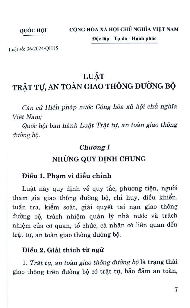 Luật Trật Tự, An Toàn Giao Thông Đường Bộ Năm 2024 Luật này quy định về quy tắc, phương tiện, người tham gia giao thông đường bộ, chỉ huy, điều khiển, tuần tra, kiểm soát, giải quyết tai nạn giao thông đường bộ, trách nhiệm quản lý nhà nước và trách nhiệm của cơ quan, tổ chức, cá nhân có liên quan đến trật tự, an toàn giao thông đường bộ.