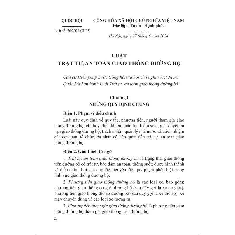 Mua tại TiktokQUỐC HỘI Luật số: 36/2024/QH15 CỘNG HÒA XÃ HỘI CHỦ NGHĨA VIỆT NAM Độc lập – Tự do – Hạnh phúc Hà Nội, ngày 27 tháng 6 năm 2024 LUẬT TRẬT TỰ, AN TOÀN GIAO THÔNG ĐƯỜNG BỘ Căn cứ Hiến pháp nước Cộng hòa xã hội chủ nghĩa Việt Nam; Quốc hội ban hành Luật Trật tự, an toàn giao thông đường bộ. Chương I NHỮNG QUI ĐỊNH CHUNG Điều 1. Phạm vi điều chỉnh Luật này qui định về quy tắc, phương tiện, người tham gia giao thông đường bộ, chỉ huy, điều khiển, tuần tra, kiểm soát, giải quyết tại nạn giao thông đường bộ, trách nhiệm quản lý nhà nước và trách nhiệm của cơ quan, tổ chức, cá nhân có liên quan đến trật tự, an toàn giao thông đường bộ. Điều 2. Giải thích từ ngữ