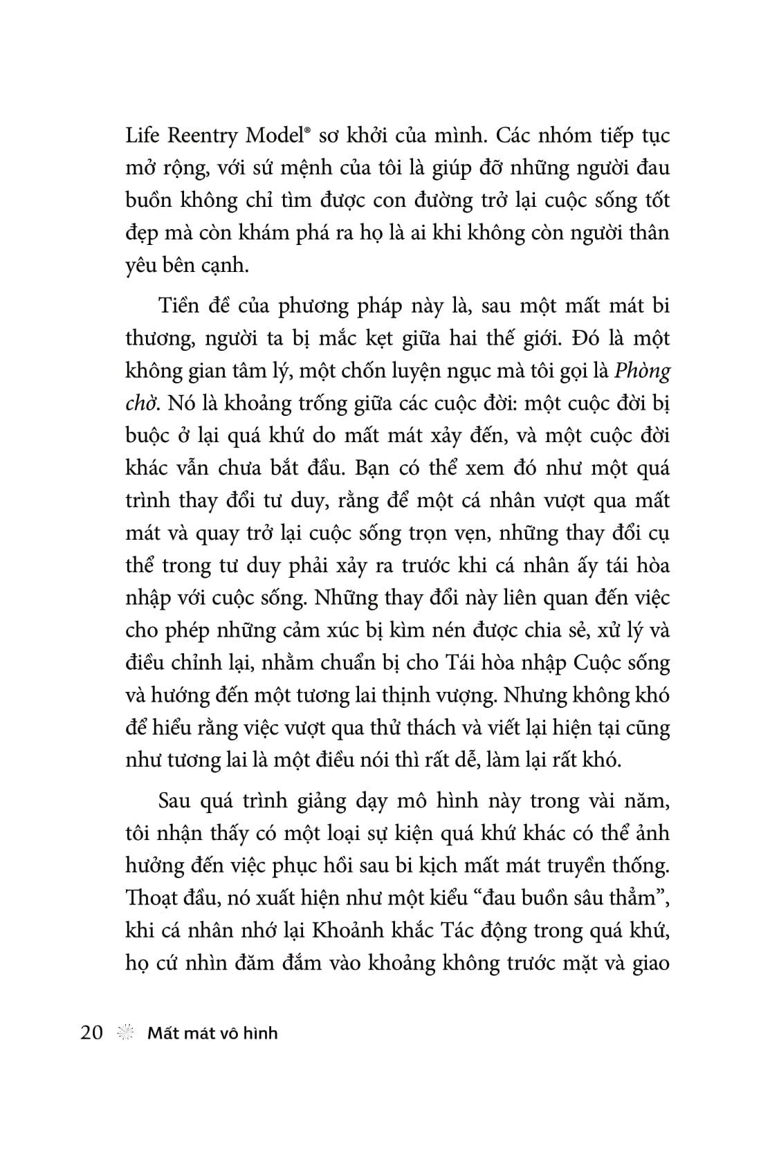 Tác giả đưa ra khái niệm Phòng chờ – nơi mà những người từng trải qua mất mát vô hình mắc kẹt. Họ có thể sống trong trạng thái chấp nhận, thích nghi nhưng không thực sự phát triển. Họ tiếp tục công việc, duy trì các mối quan hệ và làm mọi thứ theo đúng trách nhiệm, nhưng lại không cảm thấy kết nối với cuộc sống. Đó là dấu hiệu của một người đang sinh tồn, chứ không phải thực sự sống.