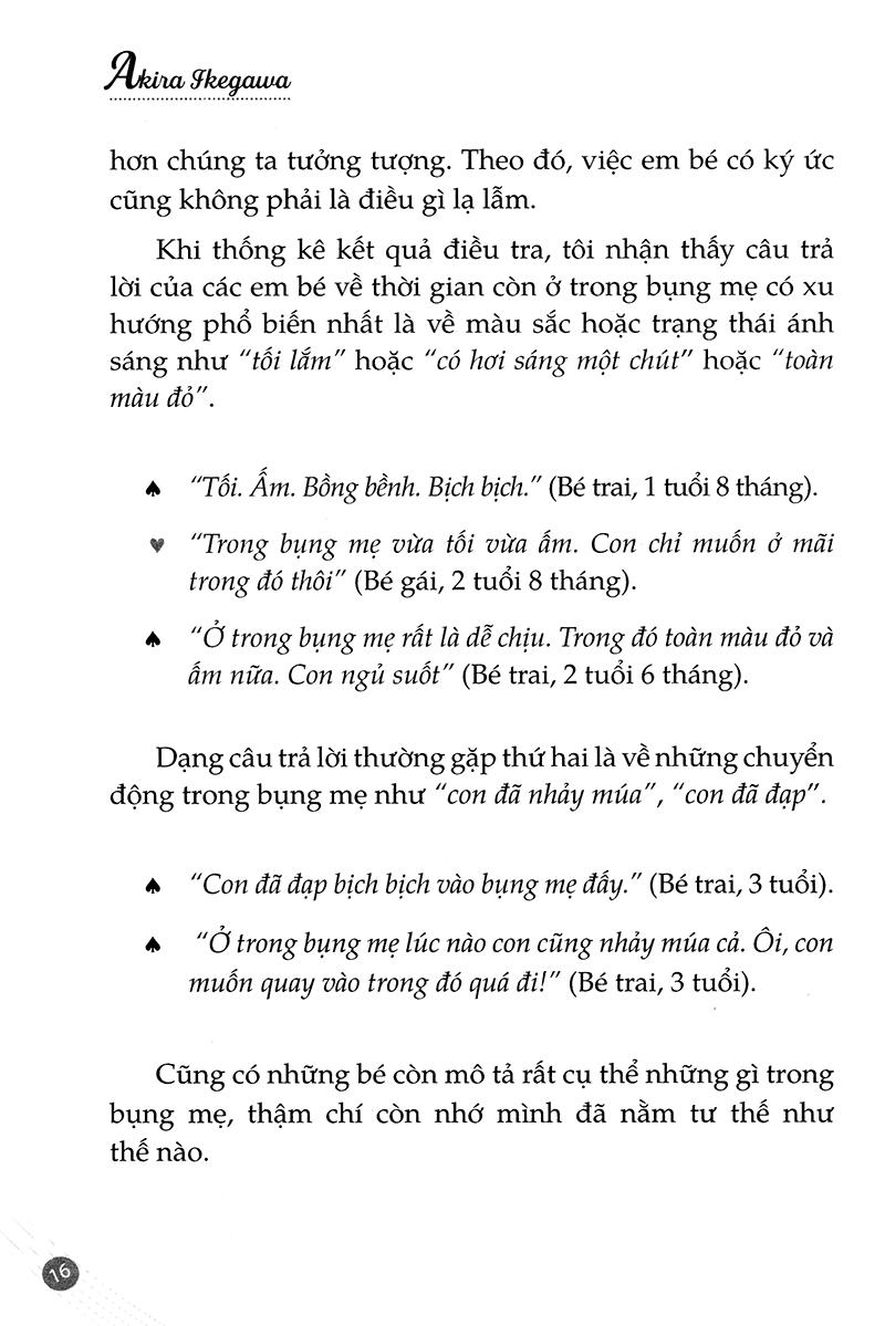 Lời giới thiệu: Có phải bạn nghĩ rằng em bé không biết gì cả Chương 1: Em bé chọn bố mẹ để sinh ra Chương 2: Hãy trò chuyện với em bé trong bụng mẹ Chương 3: Sinh con thật là hạnh phúc Chương 4: Sau khi sinh vẫn chưa muộn Chương 5: Những điều thật sự quan trọng trong việc nuôi dạy con Chương 6: Sinh con là một cột mốc trên con đường nuôi dạy con Mẩu chuyên: Nào, hãy cùng nghe các bé kế câu chuyện của m.ình nhé!