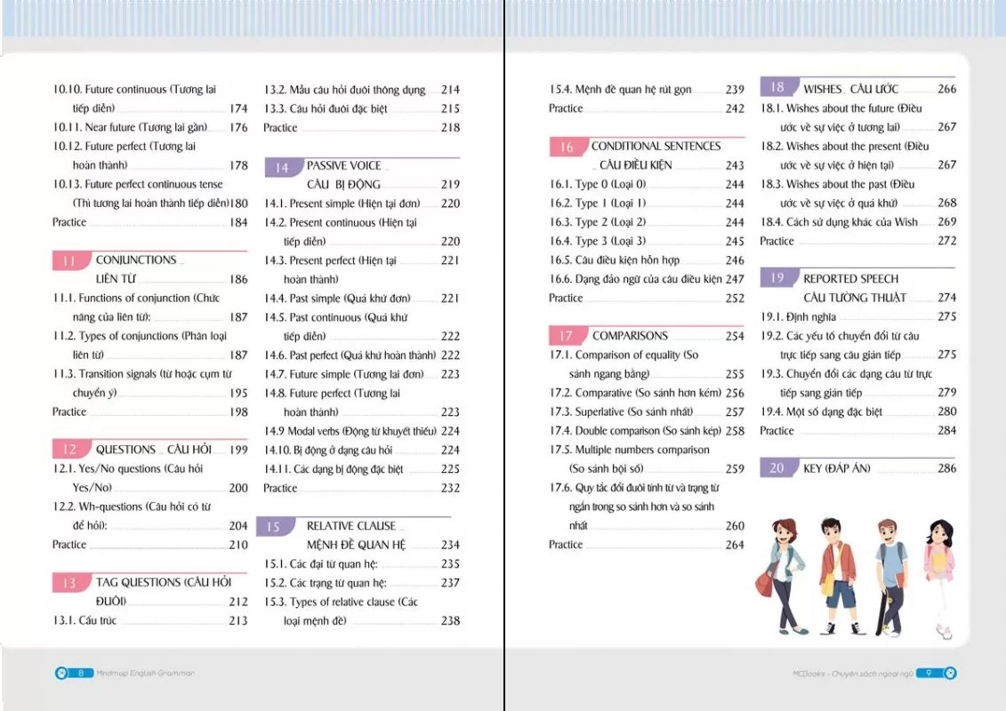 Cuốn sách Mind Map English Grammar – Ngữ pháp tiếng Anh bằng sơ đồ tư duy có tổng cộng 19 chủ đề, bao gồm: