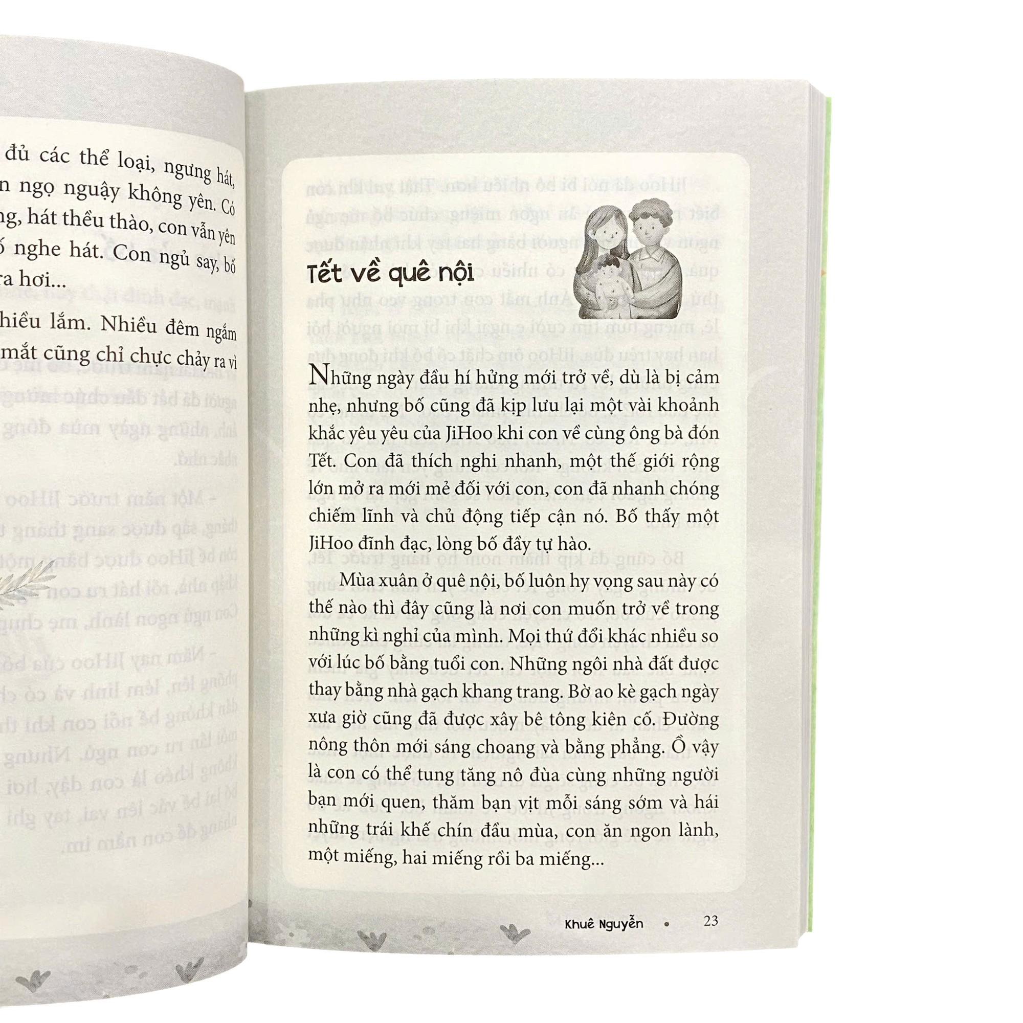 Bạn đọc sẽ theo chân tác giả qua những khoảnh khắc đời thường cùng các con – từ ngày con chào đời, sinh nhật đầu tiên, đến những lần con ốm hay lần đầu con đón Tết, về chơi quê nội, ngoại. Mỗi câu chuyện đều rất nhỏ bé, nhưng bằng cách kể mộc mạc và chân thành, chúng trở nên lớn lao một cách dịu dàng, như tình yêu mà bố dành cho JiHoo và Nhột, những cái tên thân thương đầy trìu mến.