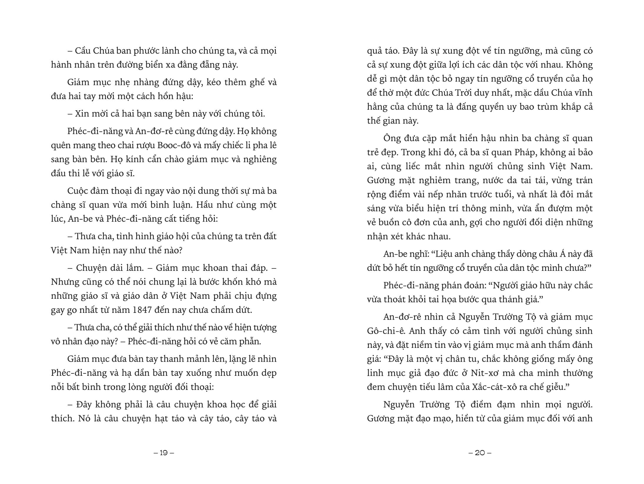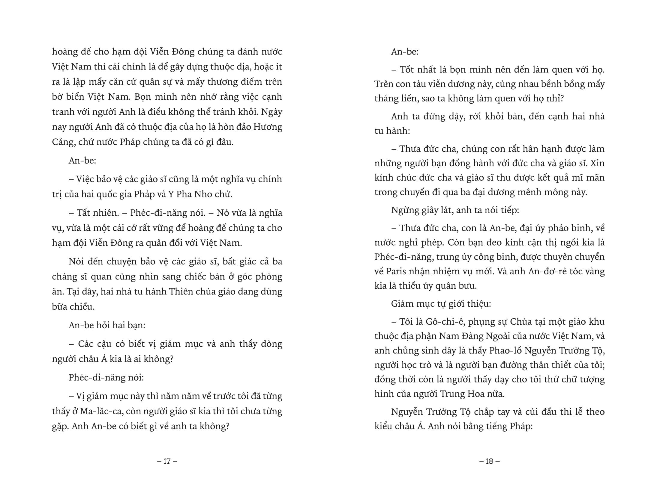“… Cả ba sĩ quan Pháp, không ai bảo ai, cùng liếc mắt nhìn người chủng sinh Việt Nam. Gương mặt nghiêm trang, nước da tai tái, vừng trán rộng điểm vài nếp nhăn trước tuổi, và nhất là đôi mắt sáng vừa biểu hiện trí thông minh, vừa ẩn đượm một vẻ buồn cô đơn của anh, gợi cho người đối diện những nhận xét khác nhau.”