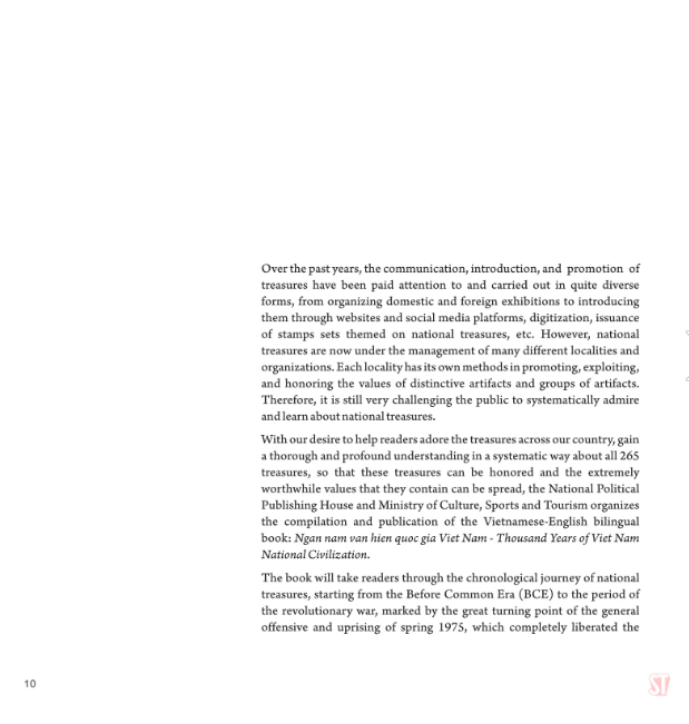 Cuốn sách song ngữ Việt - Anh Ngàn năm văn hiến quốc gia Việt Nam - Thousand years of Viet Nam National Civilization do Nhà xuất bản Chính trị quốc gia Sự thật phối hợp với Bộ Văn hóa, Thể thao và Du lịch tổ chức biên soạn và xuất bản, mong muốn giúp độc giả được “thưởng lãm” những báu vật trên khắp đất nước ta, có được những hiểu biết một cách hệ thống, xuyên suốt, sâu sắc về toàn bộ 265 bảo vật đã được Thủ tướng Chính phủ công nhận qua 11 đợt từ năm 2012 đến năm 2023, để những báu vật này được tôn vinh, lan tỏa những giá trị vô cùng quý giá mà chúng chứa đựng.