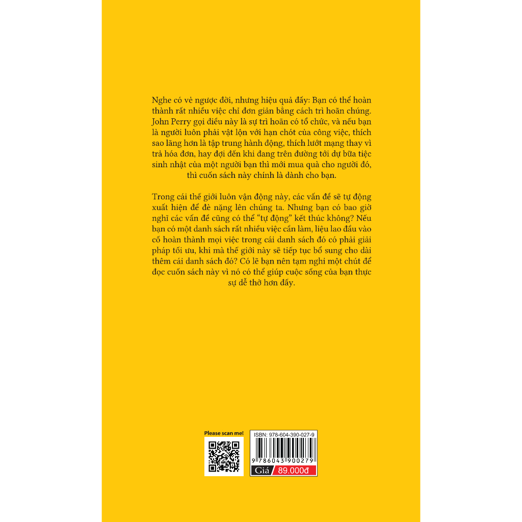 Nghe có vẻ ngược đời, nhưng hiệu quả đây: Bạn có thể hoàn thành rất nhiều việc chỉ đơn giản bằng cách trì hoãn chúng. John Perry gọi điều này là sự trì hoãn có tổ chức và nếu bạn là người luôn phải vật lộn với hạn chót của công việc, thích sao lãng hơn là tập trung hành động, thích lướt mạng thay vì trả hóa đơn, hay đơi đến khi đang trên đường tới dự bữa tiệc sinh nhật của một người bạn thì mới mua quà cho người đó, thì cuốn sách này chính là dành cho bạn.