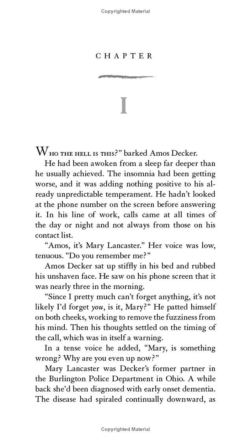 When Amos Decker is called to South Florida to investigate a double homicide, the case appears straightforward: A federal judge and her bodyguard have been found dead, the judge’s face sporting a blindfold with two eye holes crudely cut out, a clear sign that she’d made one too many enemies over her years on the bench.