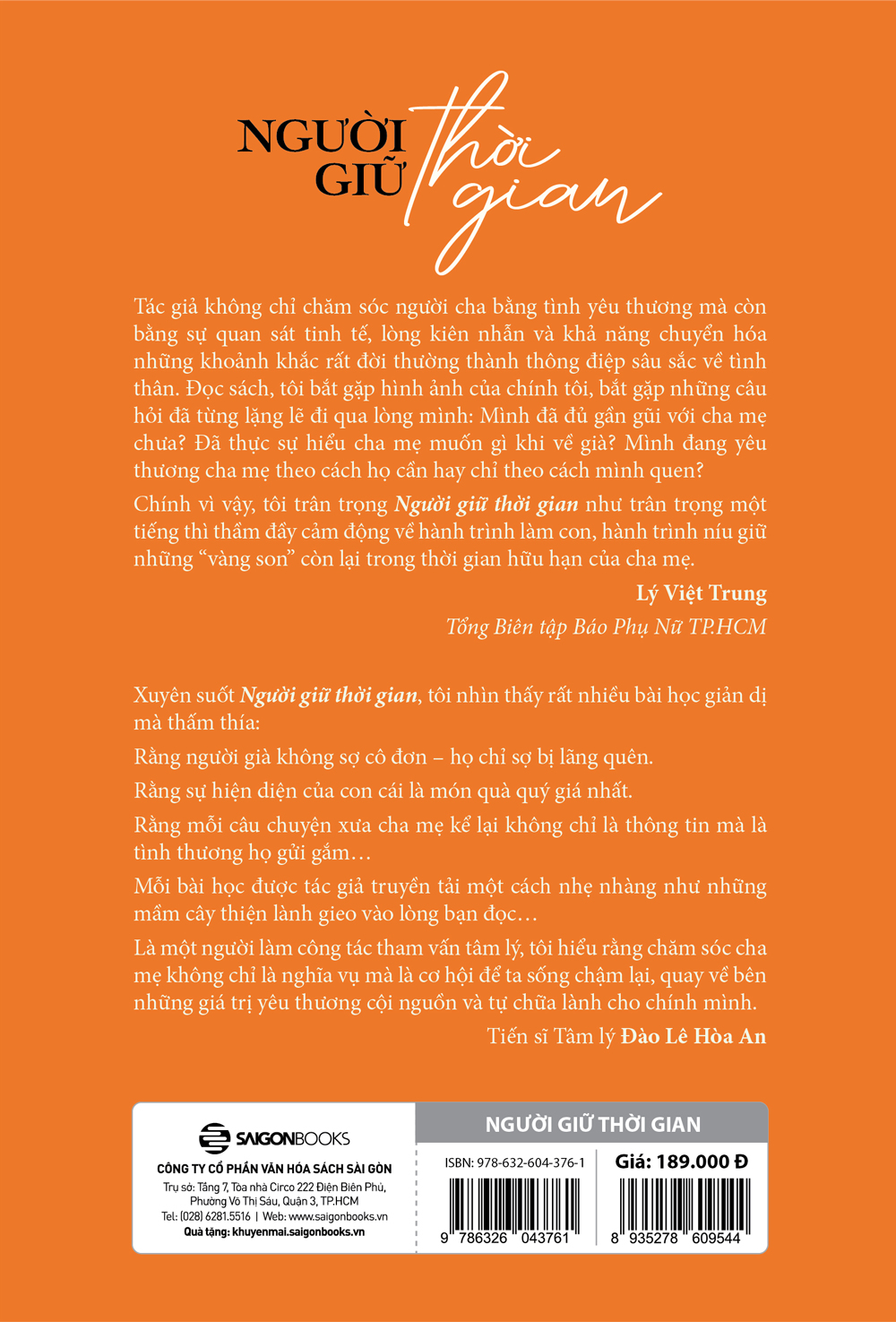 “Chúng ta nói nhiều về dinh dưỡng, bệnh lý tuổi già, nhưng lại ít khi dừng đủ lâu để lắng nghe những thay đổi trong nội tâm của cha mẹ khi về già: nỗi cô đơn, cảm giác bị gạt ra bên lề hay niềm khát khao rất giản dị – được con cái hiểu mình. Những câu chuyện về chữ hiếu, về tình cảm cha mẹ – con cái luôn là dòng chảy âm thầm nhưng bền bỉ, chạm đến trái tim người đọc…Trong bối cảnh thị trường sách hiện nay, nơi các đầu sách kỹ năng, giải trí, kinh doanh luôn chiếm phần lớn diện tích trên kệ, “Người giữ thời gian” lặng lẽ mở ra một không gian rất riêng: không gian của ký ức, cảm xúc, sự chăm sóc và chữa lành. Đây không phải là sách hướng dẫn, càng không phải nhật ký. Đây là một bảng chỉ dẫn tinh thần được viết bằng trải nghiệm thật, bằng tình thương thật và bằng những chiêm nghiệm rất đời của một người con đã chọn ở bên cha mình trong những năm tháng tuổi vàng quý giá.”