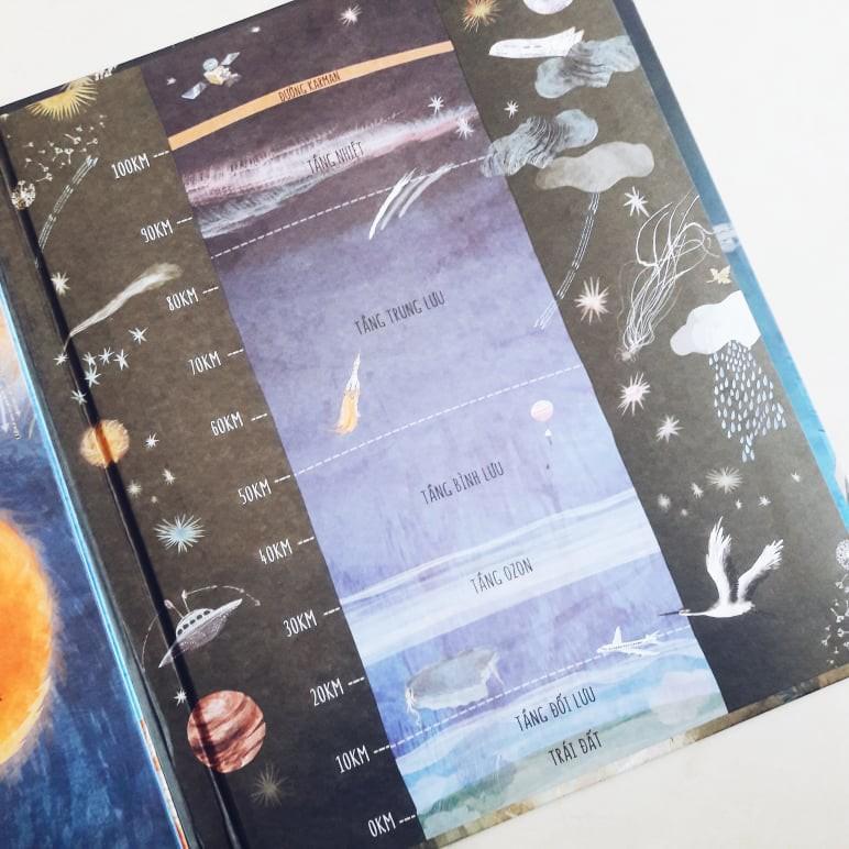 “Bầu trời vời vợi” đưa bé du hành lên bầu trời bao la. Bầu trời tưởng như trống trải, chẳng có gì ngoài mây nhỉ! Chưa chắc đâu bé ơi, mây cũng có rất nhiều loại, bầu trời còn có những loài chim bay lượn, các phương tiện như máy bay, tàu vũ trụ. Và bé sẽ biết được, bầu trời trong xanh là thế nhưng nếu ta cứ đi lên mãi thì sẽ không còn màu xanh trời nữa. Vì sao nhỉ? Bé hãy cùng tìm hiểu nha!