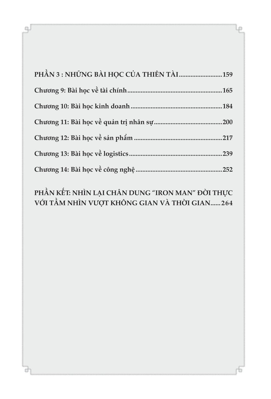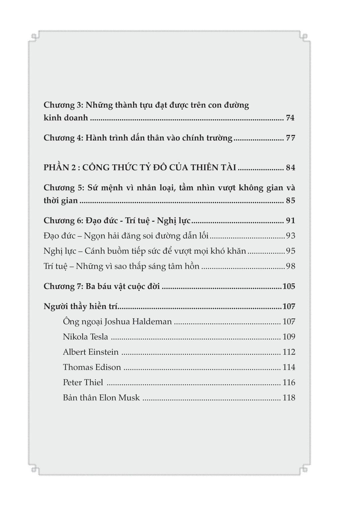 Ba phần của cuốn sách được chia làm 14 chương với nhiều nội dung xoay quan cuộc đời của Elon Musk