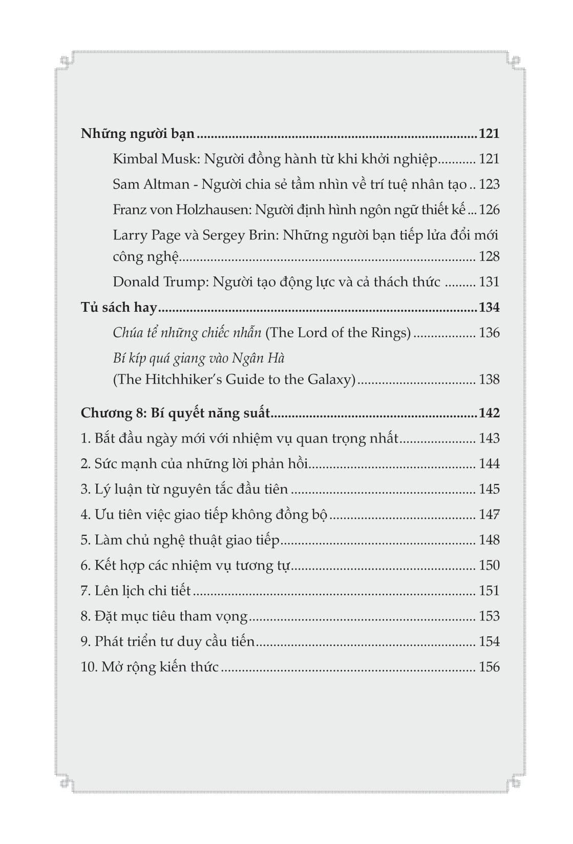 Cuối cùng, độc giả được khám phá những bài học giá trị được đúc kết trong quá trình xây dựng sự nghiệp của Musk, những bài học về kinh doanh, những quyết định về đầu tư – tài chính, những bí kíp về quản trị nhân sự... Qua đó, bạn có thể tự trả lời những câu hỏi và áp dụng nó vào trong công việc của chính m.ình.