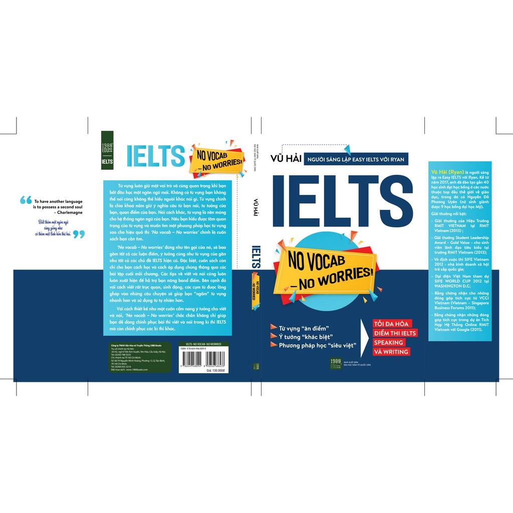 Cuốn No Vocab – No Worries sẽ giúp bạn “hóa giải” những trở ngại trên con đường chinh phục đỉnh cao IELTs. Cuốn sách được in màu với những hình minh họa sinh động, đề cập đến nhiều chủ đề khác nhau trong các đề thi thực của IELTs giúp thí sinh nâng cao vốn từ vựng cần thiết và lối tư duy để nảy ra ý tưởng và ứng biến với mọi trường hợp, mọi câu hỏi. Những mẹo nhỏ cũng được tác giả chọn lọc và trình bày ngắn gọn, dễ hiểu. Đây quả là một cuốn sách thiết thực mà bất cứ ai trên hành trình chinh phục tấm chứng chỉ IELTS cũng nên sở hữu cho mình một cuốn.