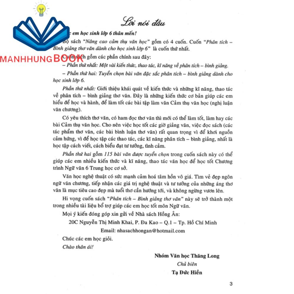 Hi vọng cuốn sách Phân Tích Bình Giảng Thơ Văn Lớp 6 này sẽ trở thành một trong nhiều tài liệu bổ trợ giúp các em học tốt môn Ngữ văn.