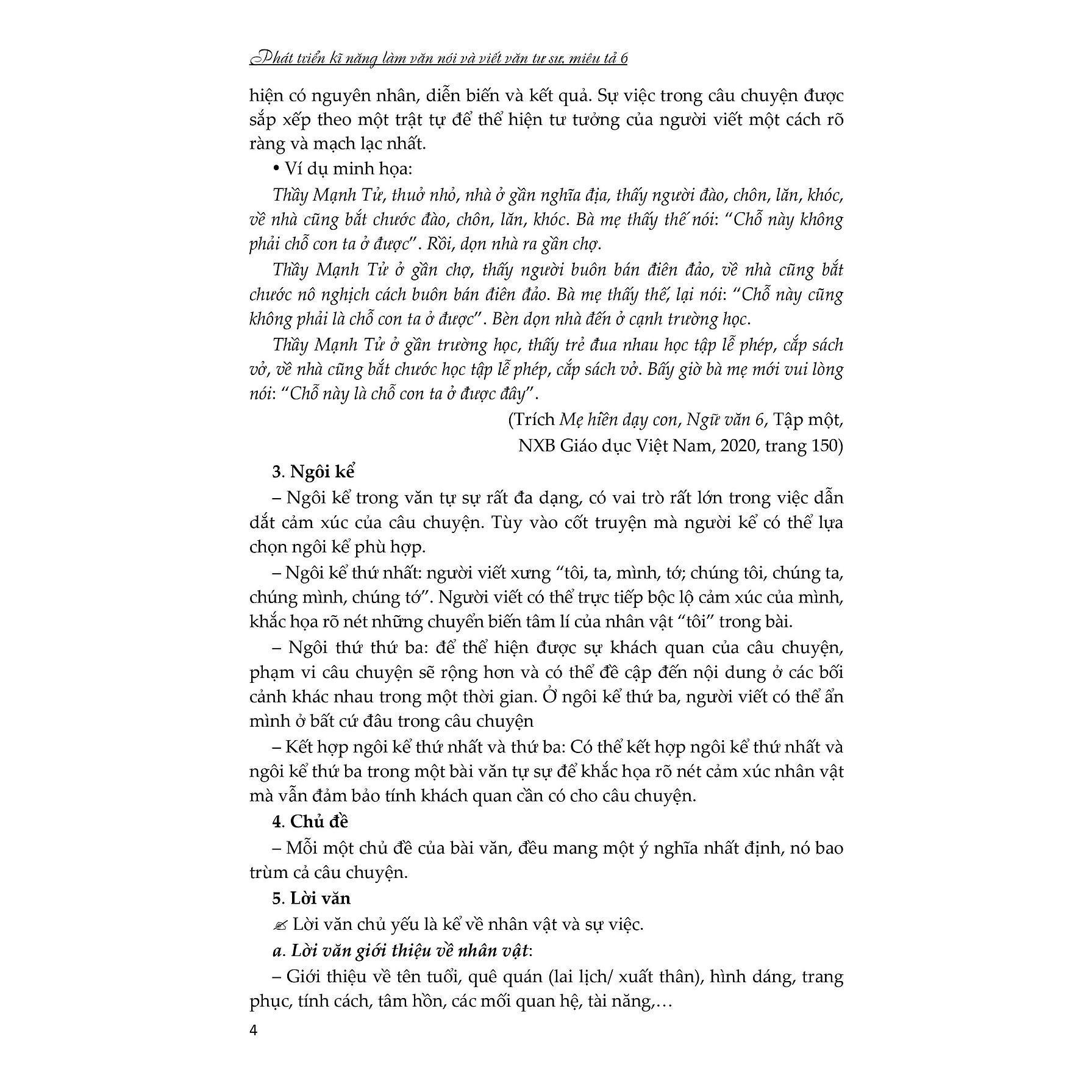 Phát Triển Kĩ Năng Làm Văn Nói Và Viết văn Tự Sự, Miêu Tả 6được biên soạn dựa trên nền kiến thức tổng chung của ba bộ sách: Cánh diều, Chân trời sáng tạo, Kết nối tri thức. Cuôns ách này khơi gợi ở các em niềm say mê khám phá thế giới và theo đuổi những ý tưởng mới mẻ. Trên tinh thần chung đó, sách giúp các em phát triển kĩ năng viết, nói, kĩ năng giải quyết những vấn đề mà lứa tuổi các em thường gặp.