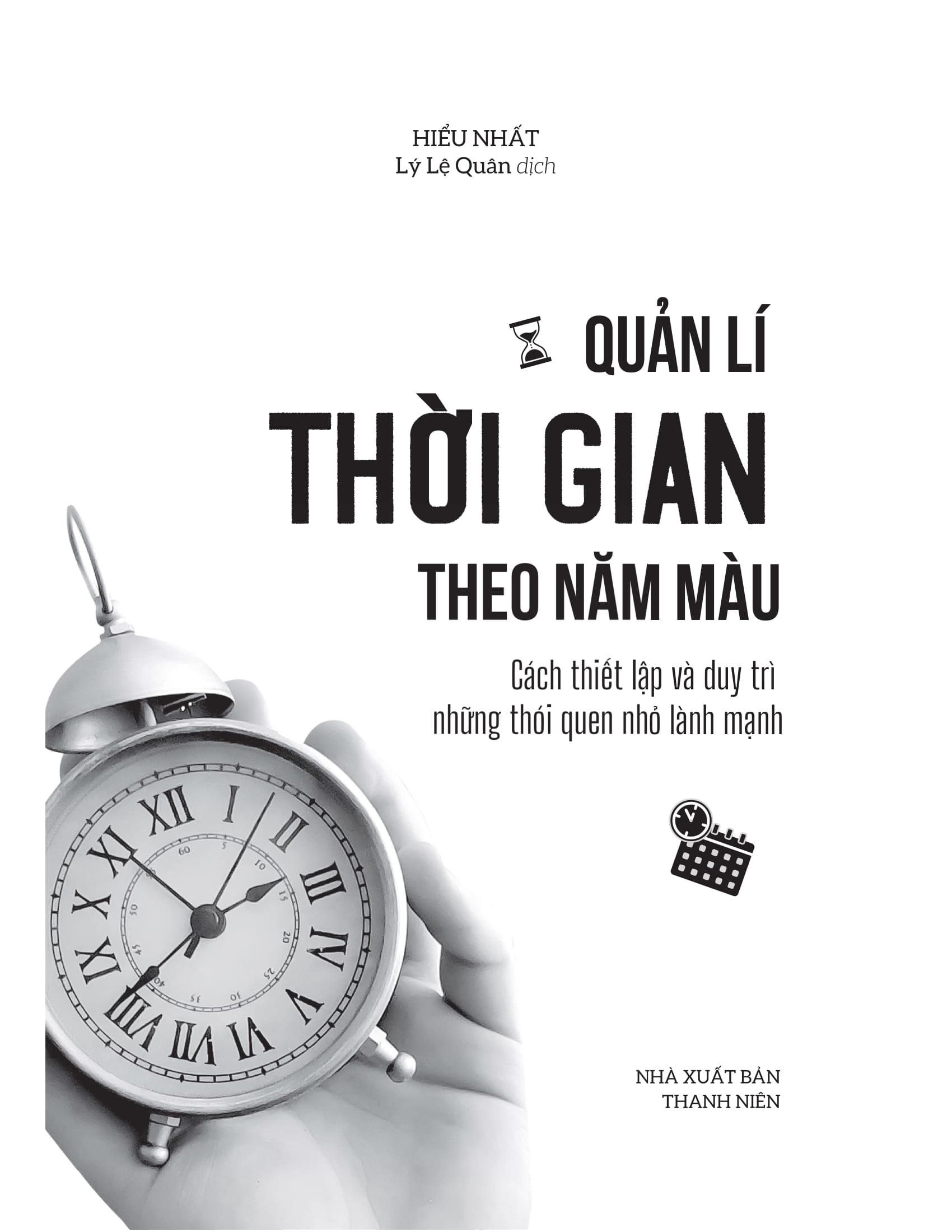 - Có gì trong cuốn sách Quản lí thời gian theo năm màu? Cuốn sách gồm 3 chương, mục đích cuối cùng là sử dụng phương pháp quản lí thời gian năm màu để dễ dàng thiết lập và duy trì những thói quen nhỏ lành mạnh trong cuộc sống. Có 5 cấp độ trong quản lí thời gian: