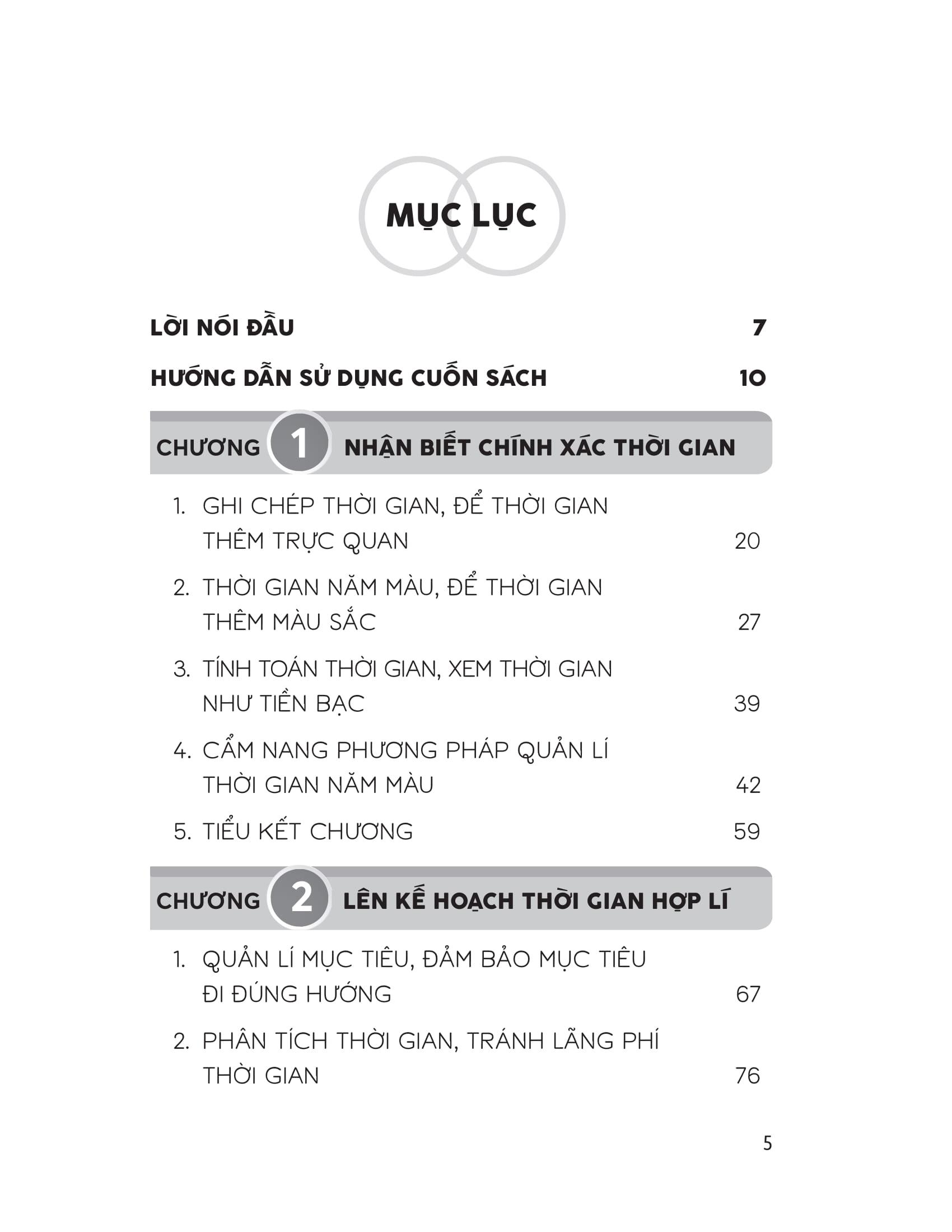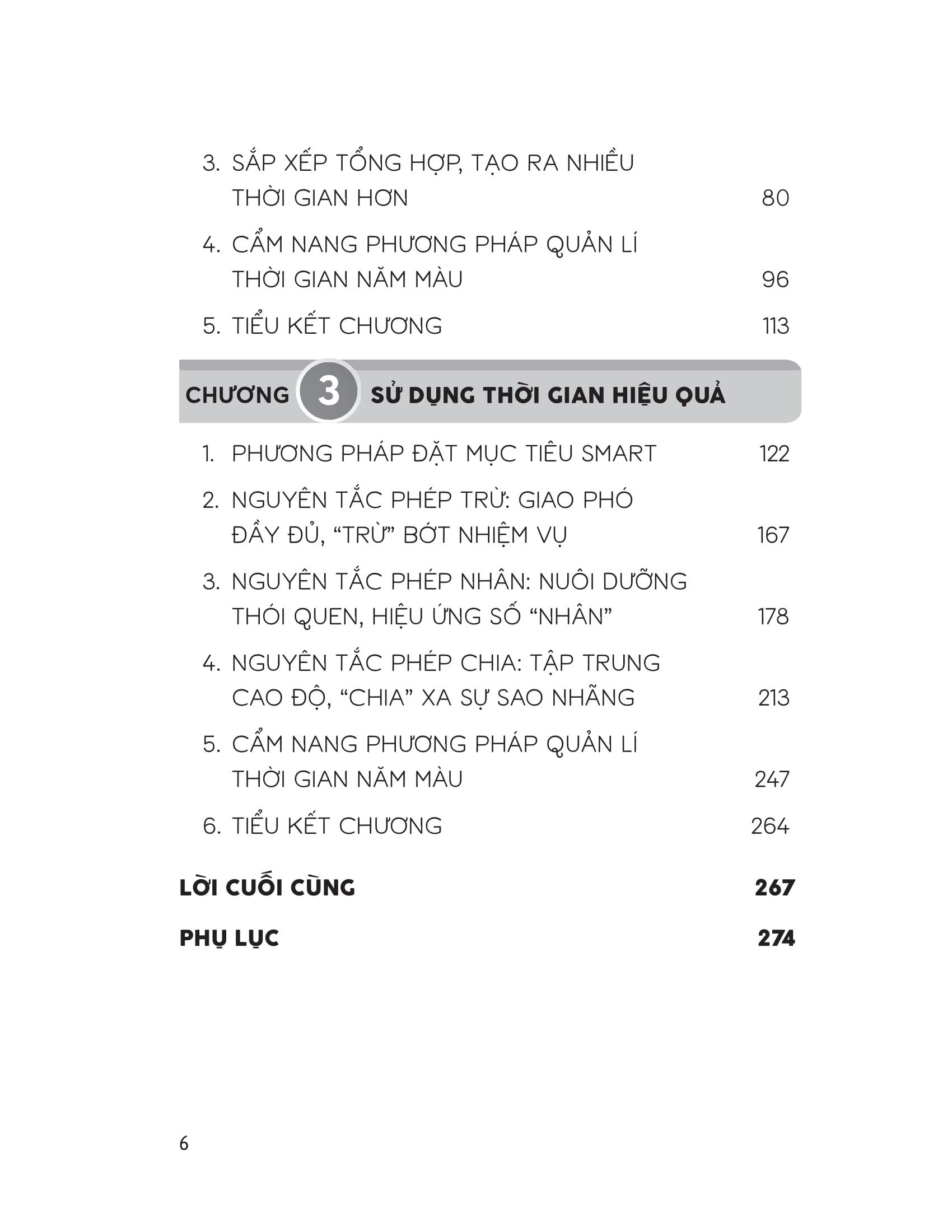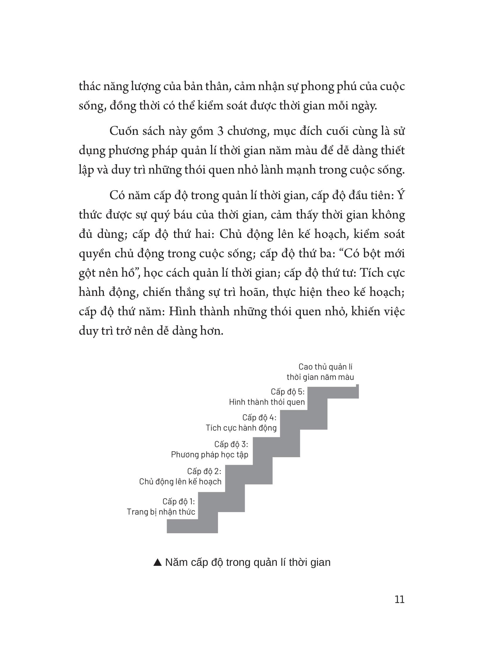 - Cấp độ thứ năm: Hình thành những thói quen nhỏ, khiến việc duy trì trở nên dễ dàng hơn. Cuốn sách này đưa ra 3 mẩu chuyện ngắn về phương pháp quản lí thời gian năm màu, 13 thực chiến quản lí thời gian năm màu, 14 cẩm nang phương pháp quản lí thời gian năm màu và 26 sơ đồ tư duy phương pháp quản lí thời gian năm màu. Trong phần Phụ lục có 11 lý thuyết quản lí thời gian thường thấy, 5 ứng dụng thường dùng để quản lí thời gian, danh mục sách tham khảo về quản lí thời gian và năm màu trong cuộc sống. Áp dụng phương pháp này vào thực tế, bạn sẽ sống một cuộc đời đầy màu sắc, cân bằng và tự do hơn!