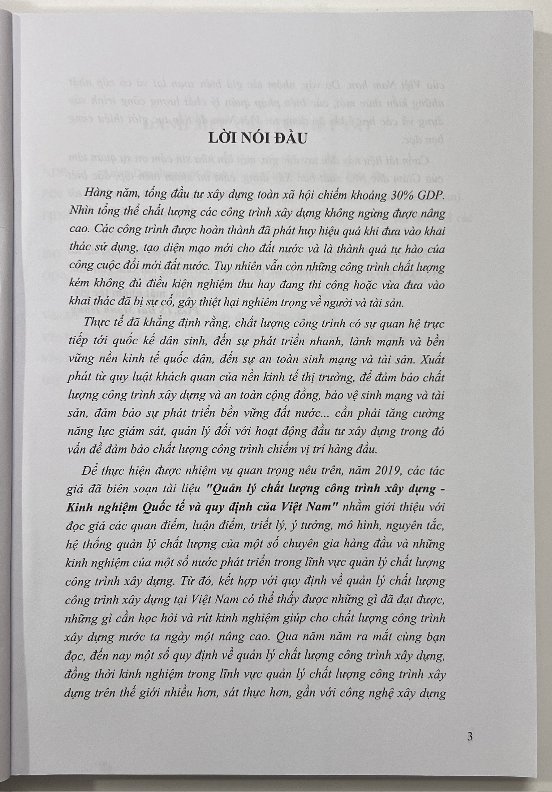 Để thực hiện được nhiệm vụ quan trọng nêu trên, các tác giả biên soạn tài liệu "Quản lý chất lượng công trình xây dựng - Kinh nghiệm Quốc tế và quy định của Việt Nam" nhằm giới thiệu với đọc giả các quan điểm, luận điểm, triết lý, ý tưởng, mô hình, nguyên tắc, hệ thống quản lý chất lượng của một số chuyên gia hàng đầu và những kinh nghiệm của một số nước phát triển trong lĩnh vực quản lý chất lượng công trình xây dựng. Từ đó, kết hợp với quy định về quản lý chất lượng công trình xây dựng tại Việt Nam có thể thấy được những gì chúng ta đã đạt được, những gì cần học hỏi và rút kinh nghiệm giúp cho chất lượng công trình xây dựng nước ta ngày một nâng cao.