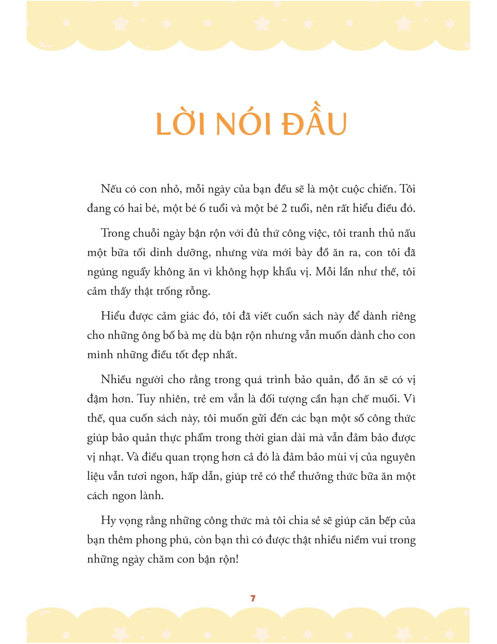 Hy vọng rằng những công thức đẹp mắt, nhanh gọn và bổ dưỡng mà tác giả chia sẻ sẽ giúp căn bếp của bạn thêm phong phú và còn bạn thì có được thật nhiều nhiều niềm vui trong những ngày chăm con bận rộn!