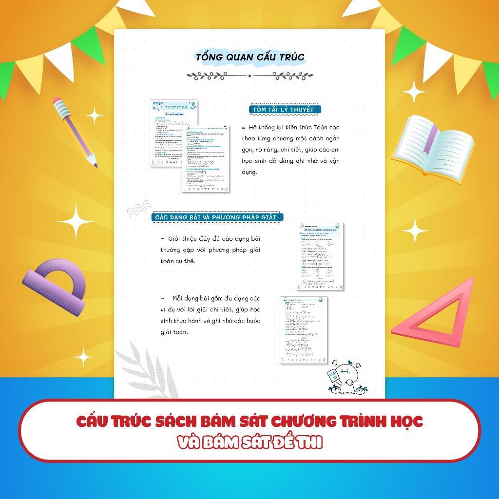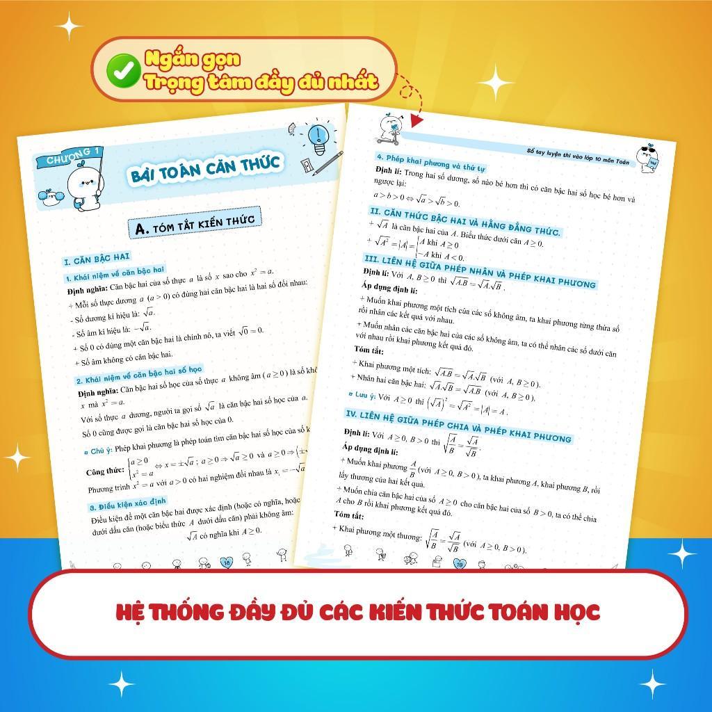 - Hệ thống kiến thức toán học ngắn gọn, trọng tâm nhất Cuốn sách bao gồm 12 chương kiến thức ngắn gọn nhất, trọng tâm nhất, chắc chắn xuất hiện 99% đề thi vào 10. Sổ tay đã được biên soạn và hệ thống hóa kiến thức toán học một cách tỉ mỉ và logic. Các chương sách được xây dựng một cách ngắn gọn, rõ ràng và chi tiết, giúp bạn nắm bắt và hiểu rõ từng khái niệm và các kiến thức cần nhớ.