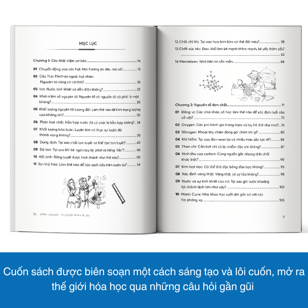 - Những thắc mắc thú vị này sẽ được giải đáp qua từng chương, giúp người đọc khám phá hóa học theo cách trực quan, dễ hiểu và đầy tính ứng dụng. Các chương cụ thể như sau: Chương 1: Các khái niệm cơ bản Chương 2: Nguyên tố đơn chất Chương 3: Hợp chất Chương 4: Hỗn hợp Chương 5: Phản ứng quan trọng