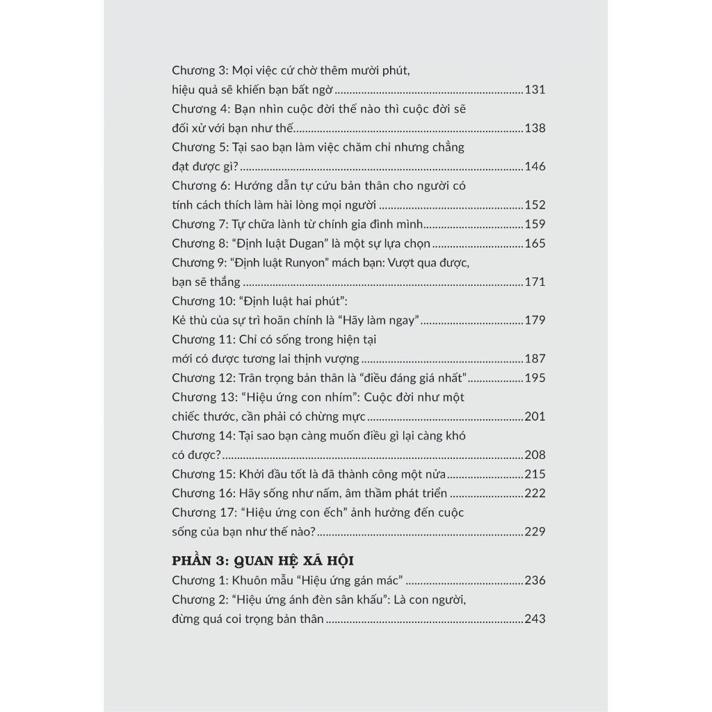 Ví dụ: “Định luật lựa chọn mâu thuẫn” được đề cập trong sách vừa hay có thể giúp bạn sắp xếp hợp lý các mục tiêu trong công việc và cuộc sống, tránh để bản thân rơi vào trạng thái mơ hồ, rối loạn; với “Hiệu ứng sandwich”, bạn sẽ biết cách đưa ra lời phê bình sao cho không làm tổn thương lòng tự trọng của đối phương, giúp họ tích cực tiếp thu và sửa chữa khuyết điểm của mình; qua “Hiệu ứng Franklin”, bạn sẽ hiểu tại sao mối nhân duyên thực sự tốt đẹp lại bắt đầu từ việc “làm phiền người khác”;…