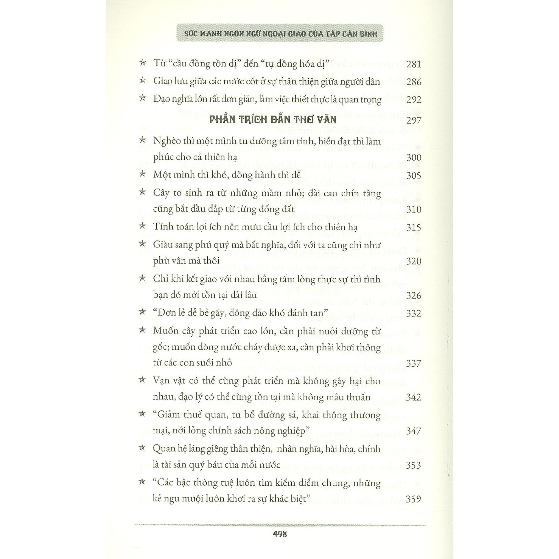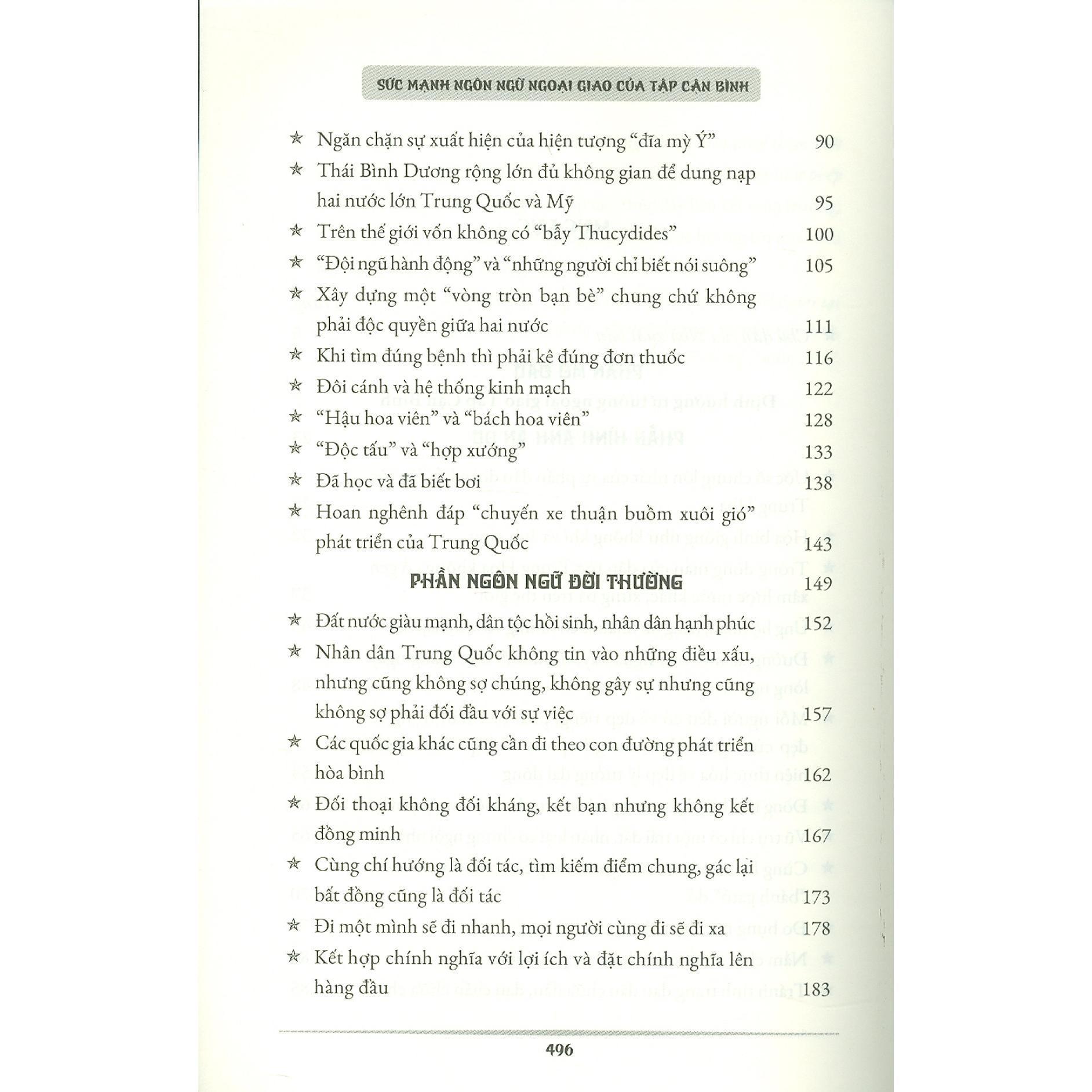 Cuốn sách gồm bốn phần: Phần mở đầu; Phần hình ảnh ẩn dụ; Phần ngôn ngữ đời thường và Phần trích dẫn thơ văn; là các bài diễn văn trước công chúng, bài trả lời phỏng vấn báo chí nước ngoài… của Tổng Bí thư, Chủ tịch Trung Quốc Tập Cận Bình, được diễn giải gắn với bố cục tổng thể đổi mới lý luận và thành tựu thực tiễn của Trung ương Đảng Cộng sản Trung Quốc kể từ Đại hội XVIII.