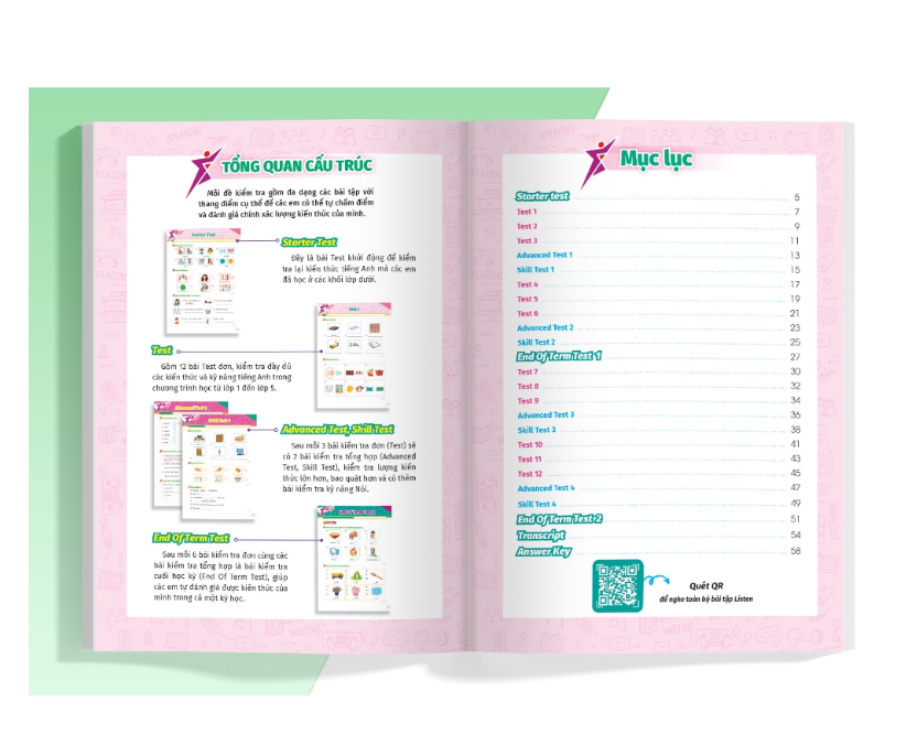 Bộ sách cung cấp các bài kiểm tra từ cơ bản đến nâng cao, bao gồm nhiều loại bài kiểm tra khác nhau, bao gồm kiểm tra từ vựng, kỹ năng nghe, đọc, viết và nói. Điều này giúp học sinh phát triển toàn diện các kỹ năng Tiếng Anh của họ và kiểm tra tất cả các khía cạnh của môn học.