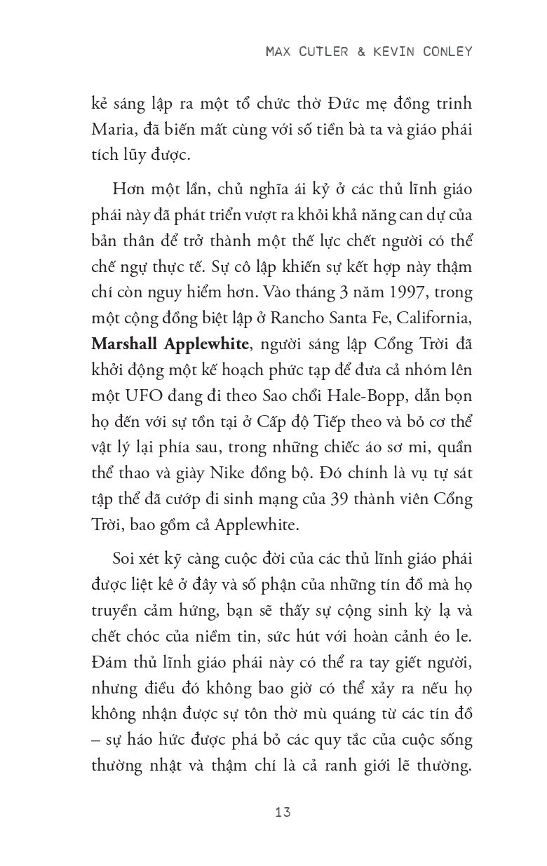 Cuốn sách được xây dựng dựa trên loạt podcast nổi tiếng Cults của Parcast – một trong những podcast dẫn đầu về đề tài giáo phái và tội phạm tâm lý học. Dưới góc nhìn cận tâm lý học và kể chuyện điều tra, Max Cutler và Kevin Conley tái hiện từng chi tiết trong cuộc đời và hành vi của các nhân vật như Charles Manson, Jim Jones, Keith Raniere, David Koresh,… những cái tên khiến cả thế giới rúng động bởi sự tàn nhẫn và khát vọng quyền lực không giới hạn.