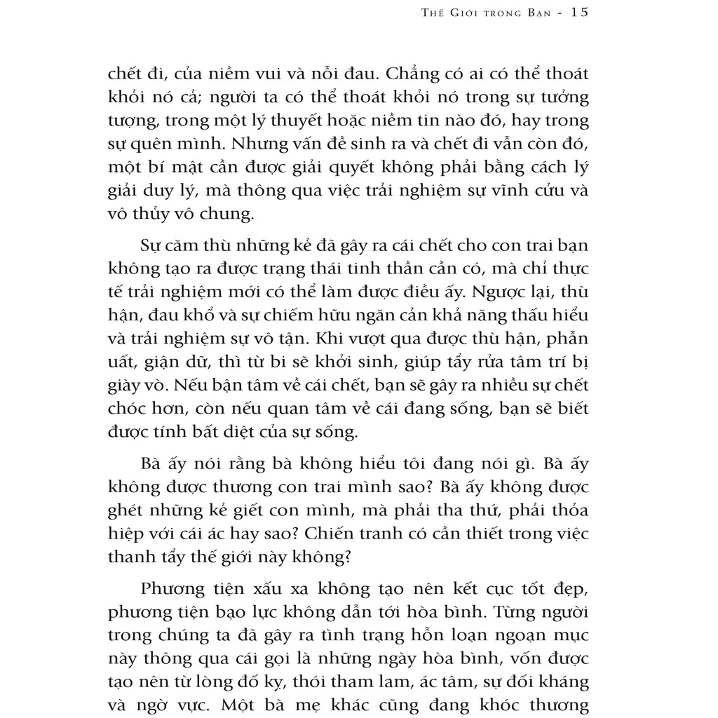 Nhưng, tự biết mình bằng cách nào và tự nhận thức như thế nào là sâu sắc? Câu trả lời sẽ được lật mở chậm rãi qua 80 bài đối thoại trong cuốn sách “Thế giới trong bạn”. Tựu trung, theo Krishnamurti, sự hiểu biết trọn vẹn về chính mình bắt đầu từ việc xem xét triệt để các suy nghĩ và cảm xúc, vượt lên trên kiến thức, không so sánh, không phán xét, không lệ thuộc vào người khác và nhất là không tuân theo bất cứ khuôn mẫu nào.