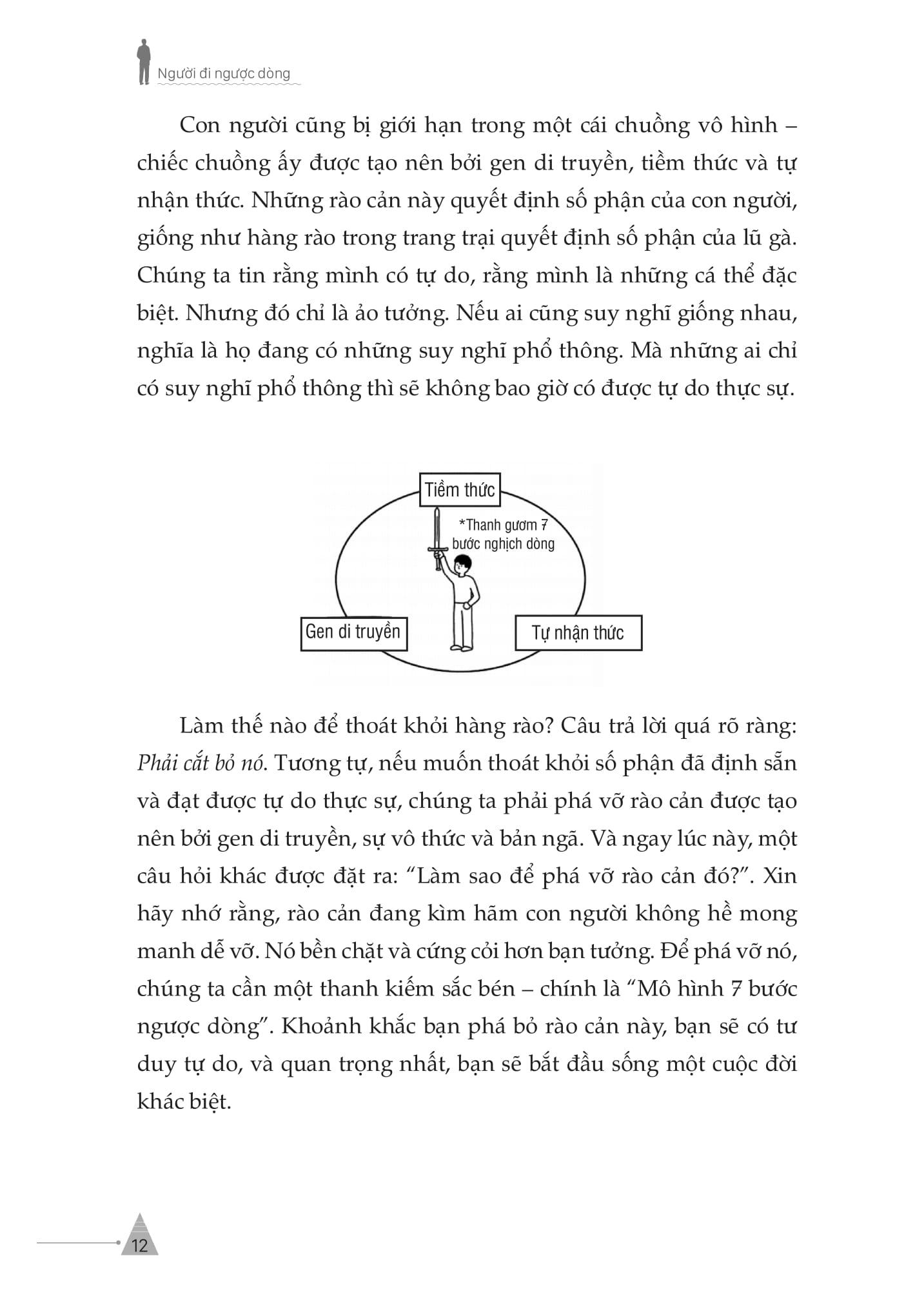 Cuốn sách được chia thành 8 chương chính, với trọng tâm là “Mô hình 7 bước ngược dòng” – một hệ thống tư duy dẫn dắt người đọc từng bước thoát khỏi rào cản tâm lý, di truyền và xã hội để kiến tạo tự do thực sự.