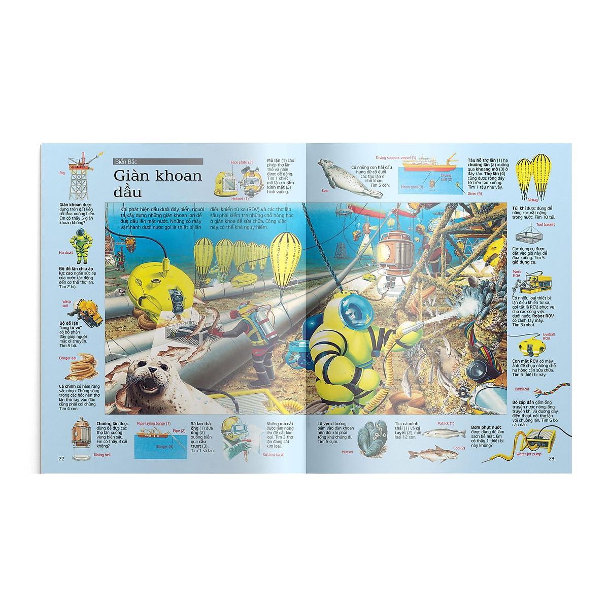 Từ bạch tuộc khổng lồ và cá mập trắng đến những thợ lặn biển sâu và kho báu dưới biển, trong các trang của cuốn sách tranh tuyệt đẹp này có nhiều thứ để em tìm kiếm. Thử tài tìm kiếm – Biển khơi chứa đựng vô vàn thông tin thú vị về thế giới trong lòng biển, từ rạn san hô kì diệu đến đáy đại dương sâu thẳm.