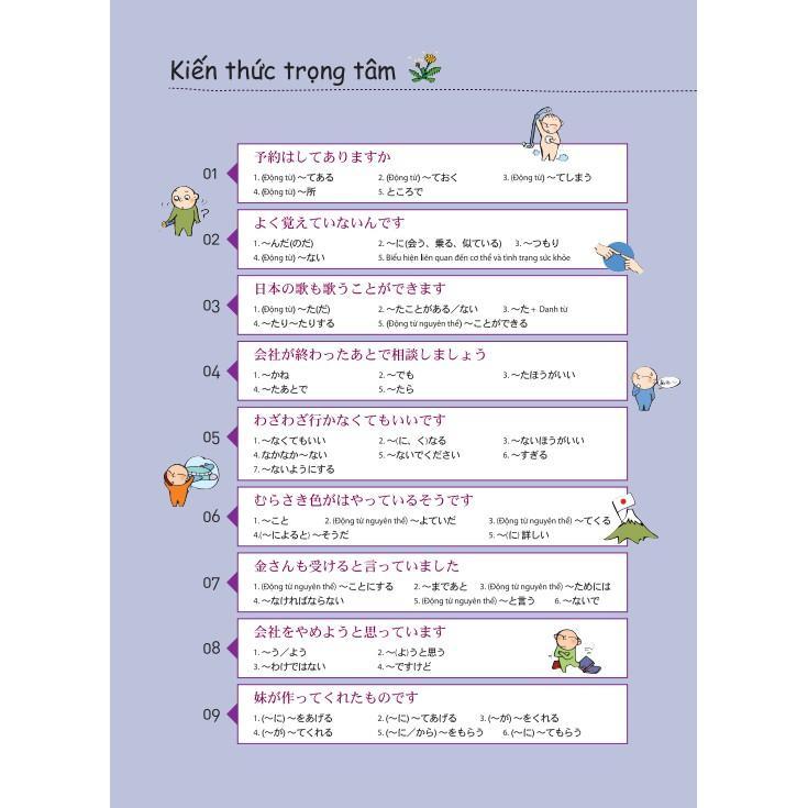 – Cấu trúc mỗi bài gồm có: Kiến thức trọng tâm, Từ vựng, Hội thoại, Đọc Hán tự, Ngữ pháp, Từ mới, Bài tập luyện tập, Hội thoại mẫu, Góc vui tiếng Nhật