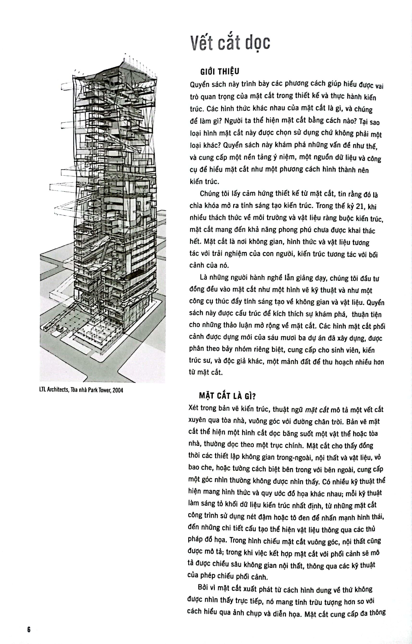Quyển sách này được hệ thống theo một cách kích thích sự khám phá và tạo ra những thảo luận mở về mặt cắt. Sáu mươi ba mặt cắt phối cảnh đã được phân theo bảy nhóm riêng biệt, cung cấp cho sinh viên, kiến trúc sư, và các độc giả khác một góc nhìn tổng quan và toàn diện để có những nghiên cứu sâu hơn về mặt cắt.