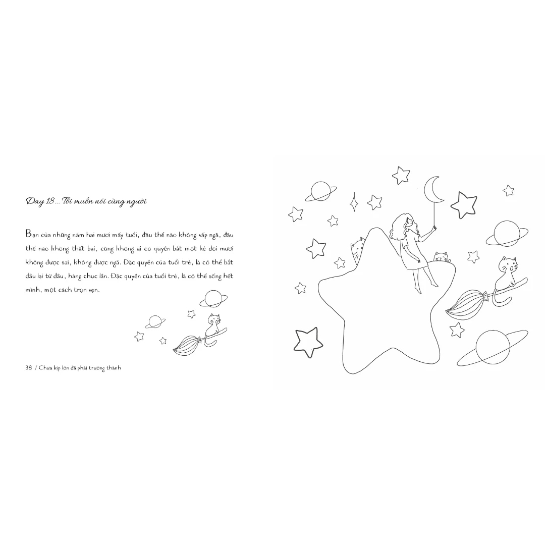 “Chưa kịp lớn đã phải trưởng thành” nay đã có phiên bản tô màu, kết hợp những lời tâm tình thủ thỉ với những bức tranh sinh động, dịu dàng. Cuốn sách như một món quà dành tặng bạn, để bạn tự tạo nên màu sắc tươi sáng tích cực, thỏa sức tô vẽ cảm xúc trên hành trình trưởng thành chênh vênh và ấp ôm bạn cùng đi qua những tháng ngày mỏi mệt.