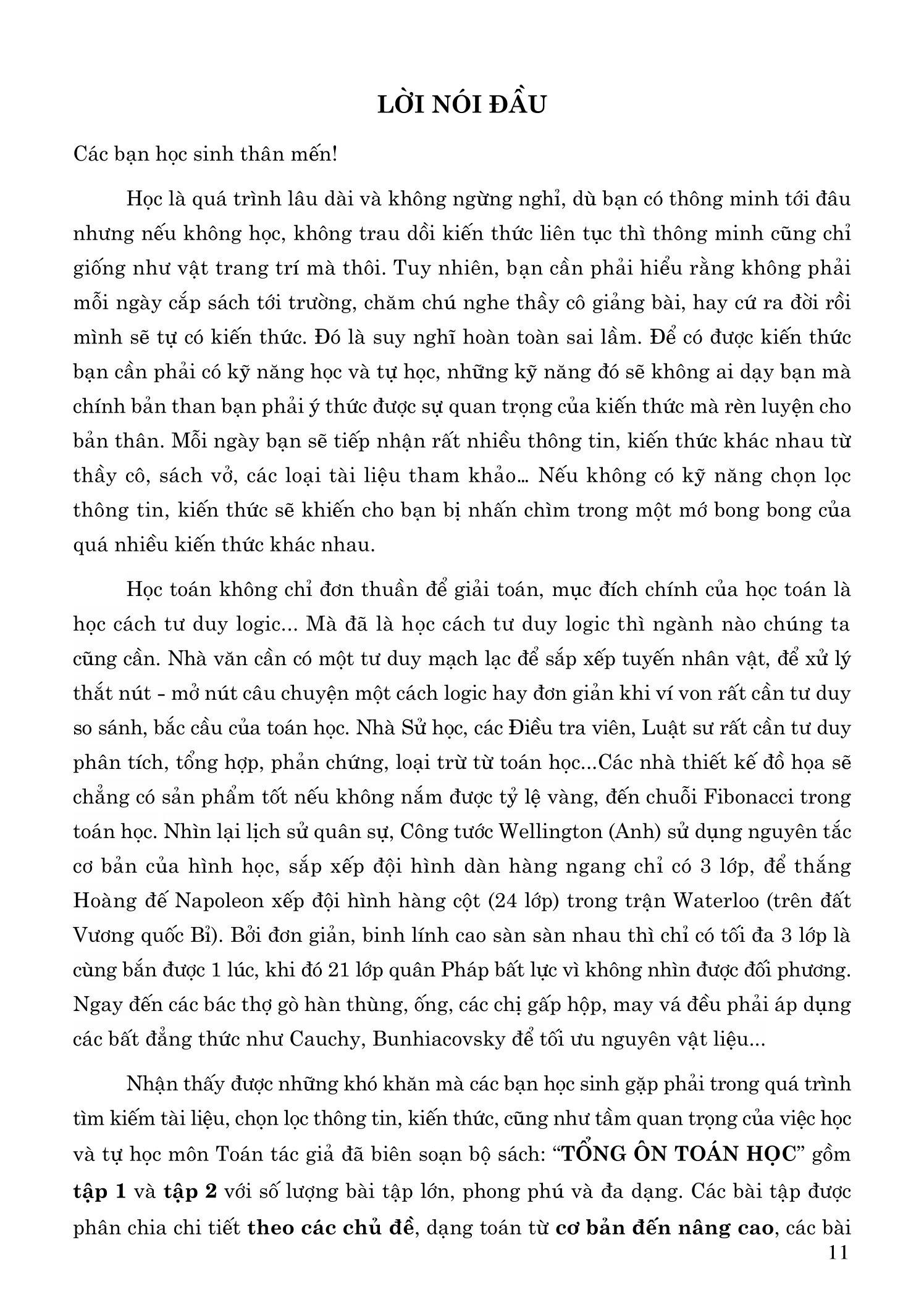 Nhận thấy được những khó khăn mà các bạn học sinh gặp phải trong quá trình tìm kiếm tài liệu, chọn lọc thông tin, kiến thức, cũng như tầm quan trọng của việc học và tự học môn Toán tác giả đã biên soạn bộ sách: “TỔNG ÔN TOÁN HỌC” gồm tập 1 và tập 2 với số lượng bài tập lớn, phong phú và đa dạng. Các bài tập được phân chia chi tiết theo các chủ đề, dạng toán từ cơ bản đến nâng cao, các bài tập cũng được sắp xếp theo thứ tự, mức độ khó tăng dần và có đáp án và lời giải chi tiết bằng cách tra ID.