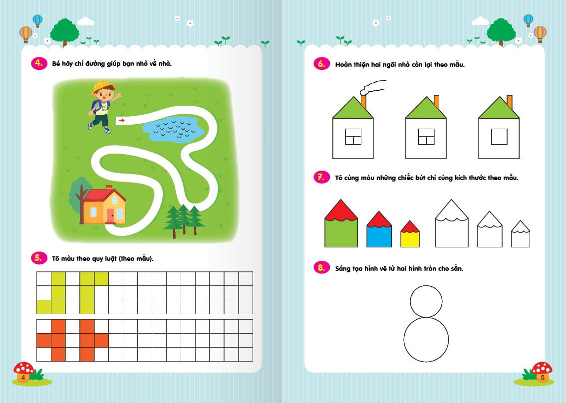 vẽ vui nhộn. Các bài tập, trò chơi kết hợp giữa rèn luyện tư duy với kiến thức tự nhiên và xã hội mà trẻ đã quen thuộc như: mê cung, ghép hình, tìm quy luật chung… phù hợp nhận thức của trẻ từ 3 - 6 tuổi giúp các bé rèn luyện và phát triển các kĩ năng cần thiết: quan sát, tưởng tượng, sáng tạo, ghi nhớ, tư duy logic và giải quyết vấn đề,…