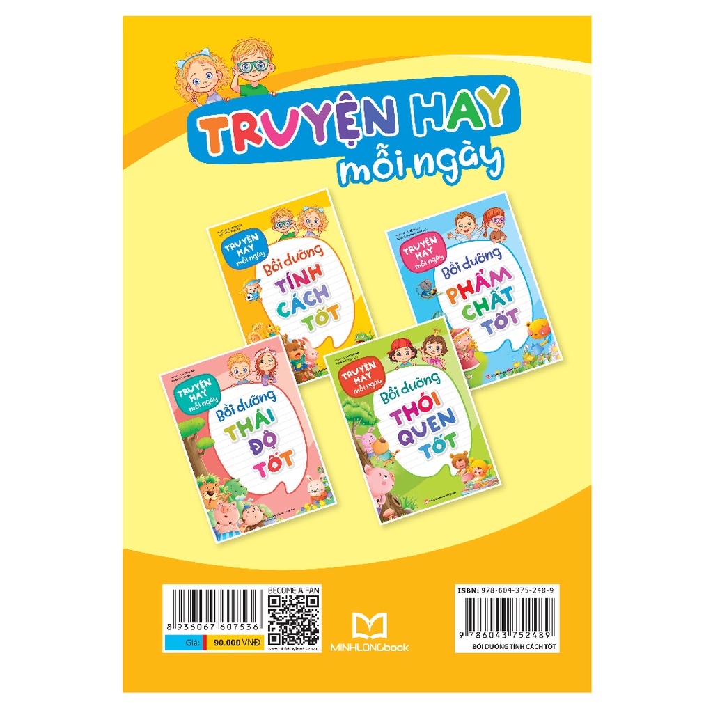 Cuốn sách chọn lọc những truyện kinh điển, truyện cổ tích, truyện ngụ ngôn đặc sắc, có độ dài vừa phải, dễ hiểu, truyền cảm để hướng dẫn các bạn nhỏ học cách cư xử trong đời sống và nâng cao ý chí. Đây thực sự là món quà quý giá mà mỗi bậc cha mẹ có thể dành cho con mình! Với chủ đề Bồi dưỡng tính cách tốt, cuốn sách mang đến 85 câu chuyện với những bài học xây dựng và rèn cho trẻ những tính cách tốt, tạo nền móng tốt cho sự phát triển của trẻ sau này. Một số câu chuyện có trong cuốn sách: - Nhím con hấp tấp - Chuột con dũng con - Cá ngựa con bướng bỉnh - Chú dê lười biếng - Tớ không còn nhát gan