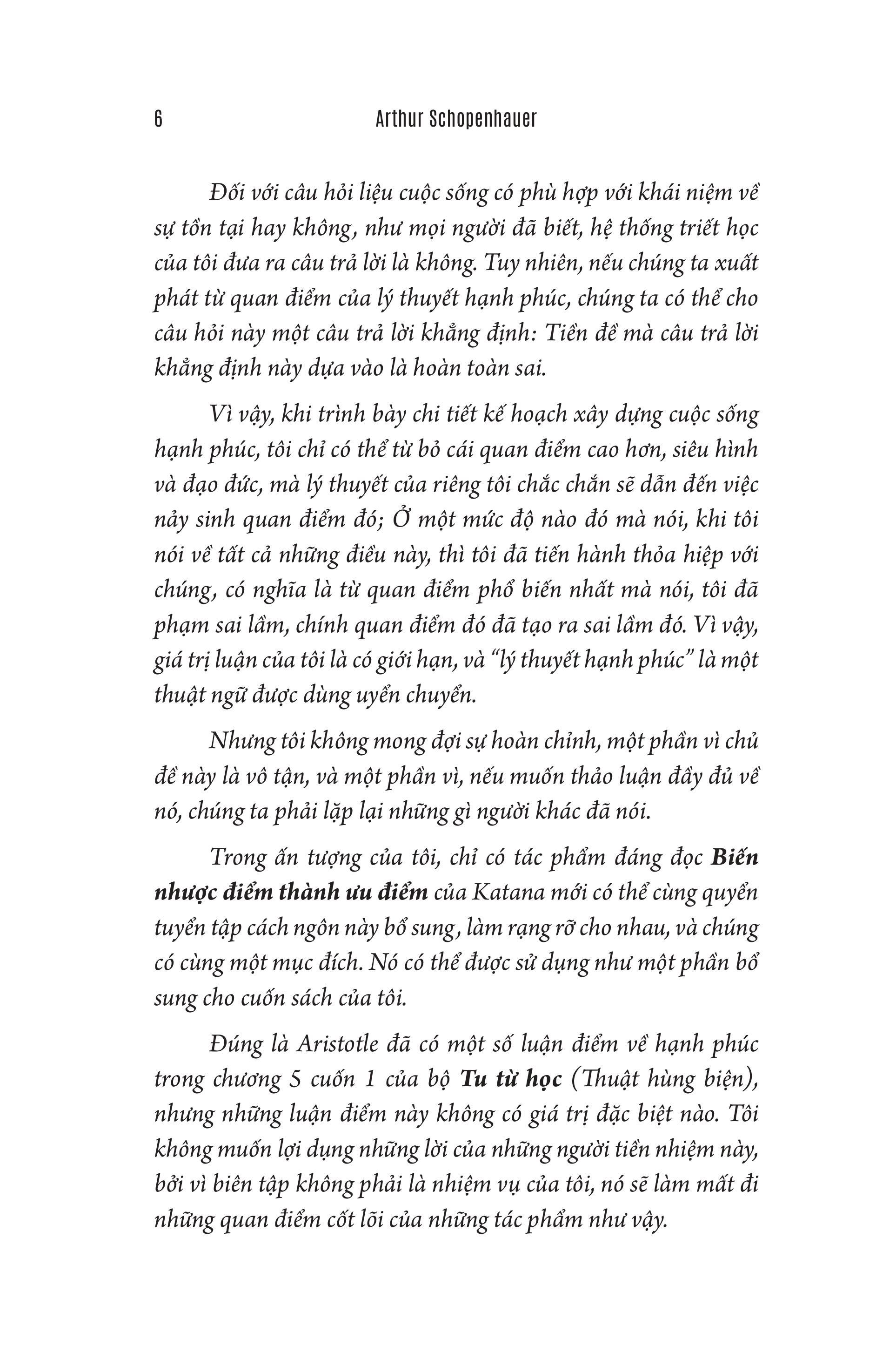 Nếu bạn có xu hướng luôn thích nhìn mọi thứ trong lấp lánh, hào quang thì rất có thể bạn sẽ thấy cuốn sách của bậc thầy triết học bi quan đầy hoài nghi. Nhưng nếu bạn đã va vấp sự giả dối của thế giới này và hiếm khi gặp một người chân thành đúng nghĩa thì thay vì nhìn về phía sau, bạn sẽ rất vui khi tìm được một người bạn đồng hành và tìm thấy sự hóm hỉnh cùng niềm an ủi trong quan điểm chua chát của Schopenhauer.