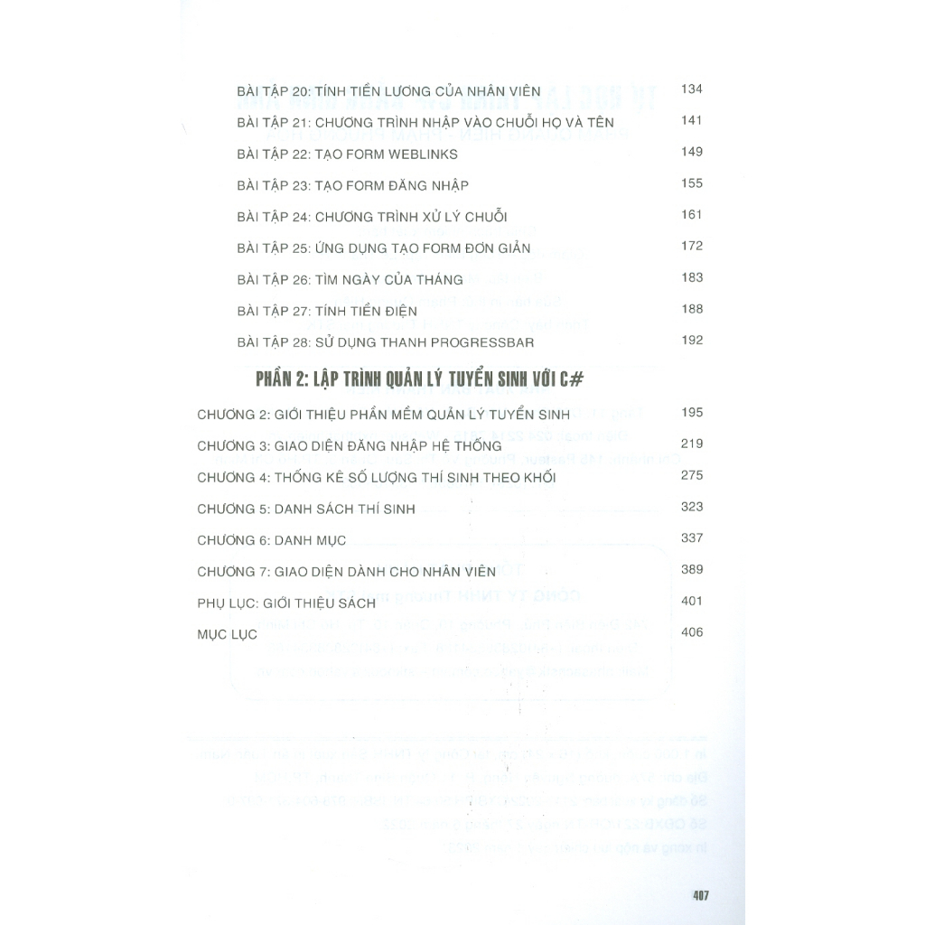 Phần 2: (Chương 2,3,4,5,6.7) Đây là trọng tâm của sách, giới thiệu từng bước lập trình phần mền quản lý tuyển sinh sinh viên làm cơ sở cho sinh viên có thể nhanh chóng làm các đồ án, báo cáo môn học tại các trường."