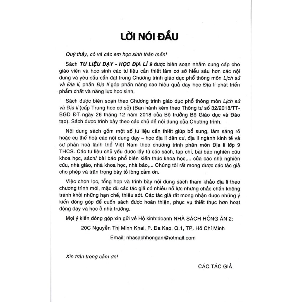 Mua tại TiktokSÁCH - Tư liệu dạy - học địa lí 9 (dùng chung cho các bộ sgk hiện hành) Tư Liệu Dạy - Học Địa Lí 9 (Dùng Chung Cho Các Bộ SGK Hiện Hành) Sách TƯ LIỆU DẠY - HỌC ĐỊA LÍ 9 được biên soạn nhằm cung cấp cho giáo viên và học sinh các tư liệu cần thiết làm cơ sở hiểu sâu hơn các nội dung và yêu cầu cần đạt trong Chương trình giáo dục phổ thông môn Lịch sử và Địa lí, phần Địa lí góp phần nâng cao hiệu quả dạy học Địa lí phát triển phẩm chất và năng lực học sinh. Sách được biên soạn theo Chương trình giáo dục phổ thông môn Lịch sử và Địa lí (cấp Trung học cơ sở) (Ban hành kèm theo Thông tư số 32/2018/TT-BGD ĐT ngày 26 tháng 12 năm 2018 của Bộ trưởng Bộ Giáo dục và Đào tạo). Sách được trình bày theo các chủ đề nội dung của Chương trình. Nội dung sách gồm một số tư liệu cần thiết giúp bổ sung, làm sáng rõ hoặc cụ thể hoá các nội dung dạy – học địa lí dân cư, địa lí ngành kinh tế và sự phân hoá lãnh thổ Việt Nam theo chương trình phân môn Địa lí lớp 9 THCS. Các tư liệu chủ yếu được lấy từ các sách, tạp chí, bài báo nghiên cứu khoa học, sách/ bài báo phổ biến kiến thức khoa học, của các nhà nghiên cứu, nhà giáo, nhà khoa học, nhà báo, Chúng tôi rất mong được các tác giả cho phép và trân trọng bày tỏ lòng cảm ơn. Việc chọn lọc, tổng hợp và trình bày nội dung sách tham khảo địa lí theo chương trình mới, mặc dù các tác giả có nhiều nỗ lực nhưng chắc chắn không tránh khỏi những hạn chế, thiếu sót. Các tác giả rất mong nhận được những ý kiến đóng góp để cuốn sách được hoàn thiện, phục vụ thiết thực hơn hoạt động dạy và học ở nhà trường.
