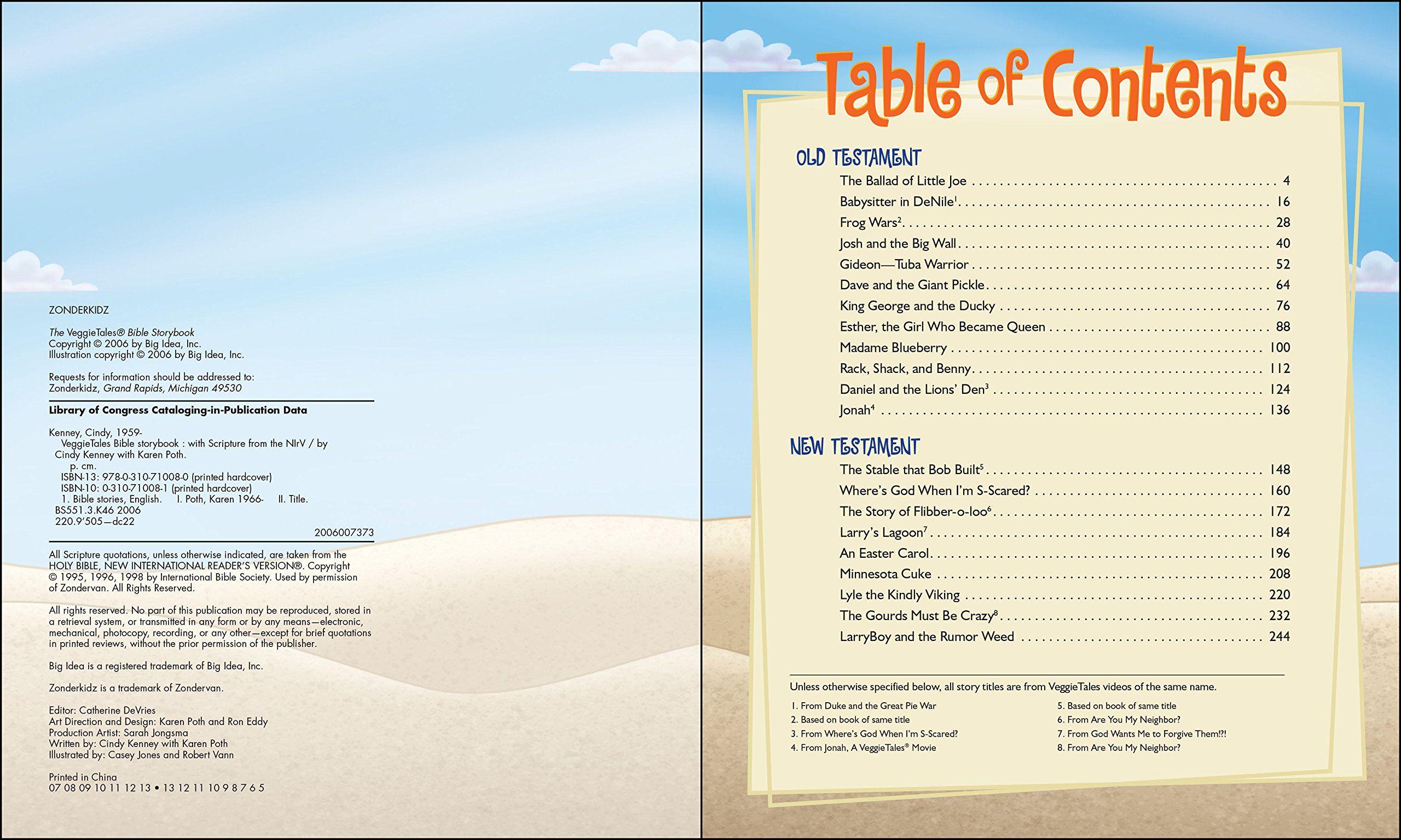 ---------------------------------------- Join Bob the Tomato, Larry the Cucumber, and all your VeggieTales friends as they share twenty favorite Bible stories. Based on the popular videos, this Bible storybook combines VeggieTales humor with great lessons. Kids will love reading these classic Veggie stories and Scripture selections that go along with them from the New International Reader's Version (NIrV--The NIV for Kids!) Have fun while learning Bible stories and the important message each one brings. Sunday morning values, Saturday morning fun!